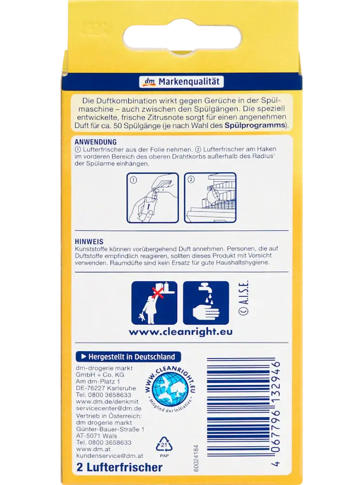 يُعد معطر غسالة الصحون برائحة الليمون من Denkmit الحل المثالي للتخلص من الروائح الكريهة داخل غسالة الصحون. بفضل رائحته الحمضية المنعشة طويلة الأمد، يمنح رائحة لطيفة تدوم حتى 50 دورة غسيل. تعمل تركيبته المطوّرة خصيصًا ليس فقط أثناء دورة الغسيل، بل أيضًا بين الدورات، مما يضمن بقاء الغسالة منعشة دائمًا. سهل الاستخدام ويُعد مساعدًا أساسيًا لكل من يهتم بالنظافة والانتعاش في المطبخ.