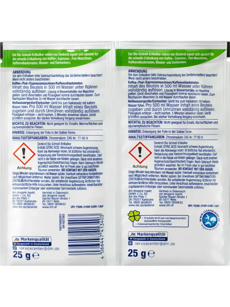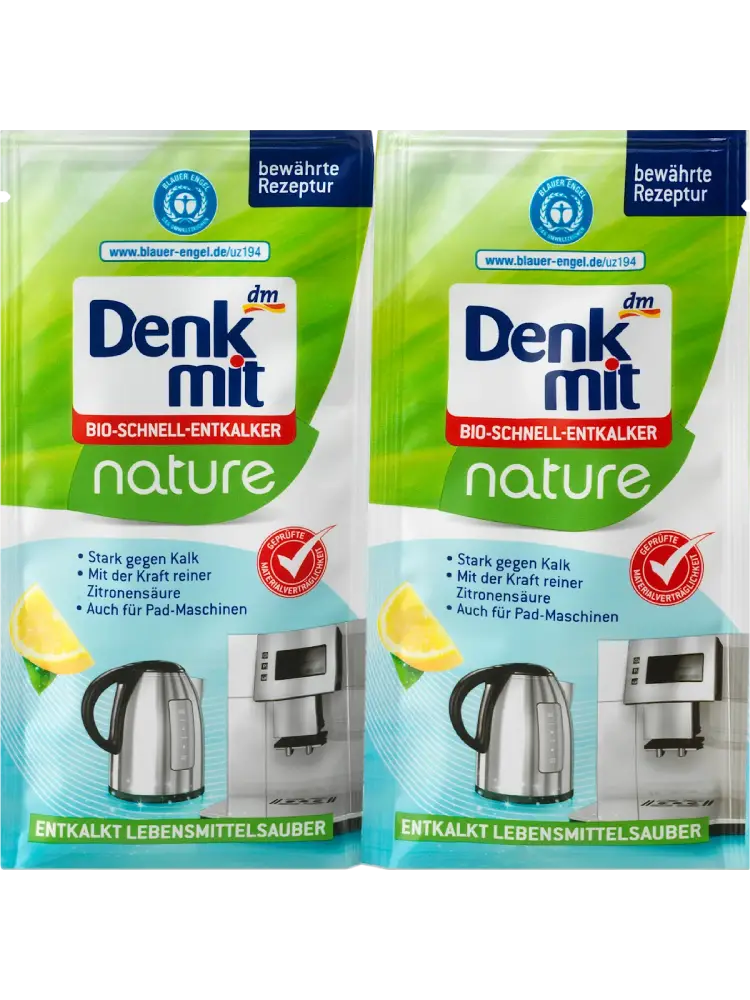 مزيل التكلسات السريع الحيوي nature من Denkmit مخصص لإزالة التكلسات بسرعة من آلات القهوة وآلات الكبسولات. كما يمكن استخدامه أيضاً لآلات القهوة الأوتوماتيكية والغلايات وأجهزة سلق البيض. بفضل قوة حمض الستريك النقي، يتميّز بفعالية عالية ضد التكلسات.