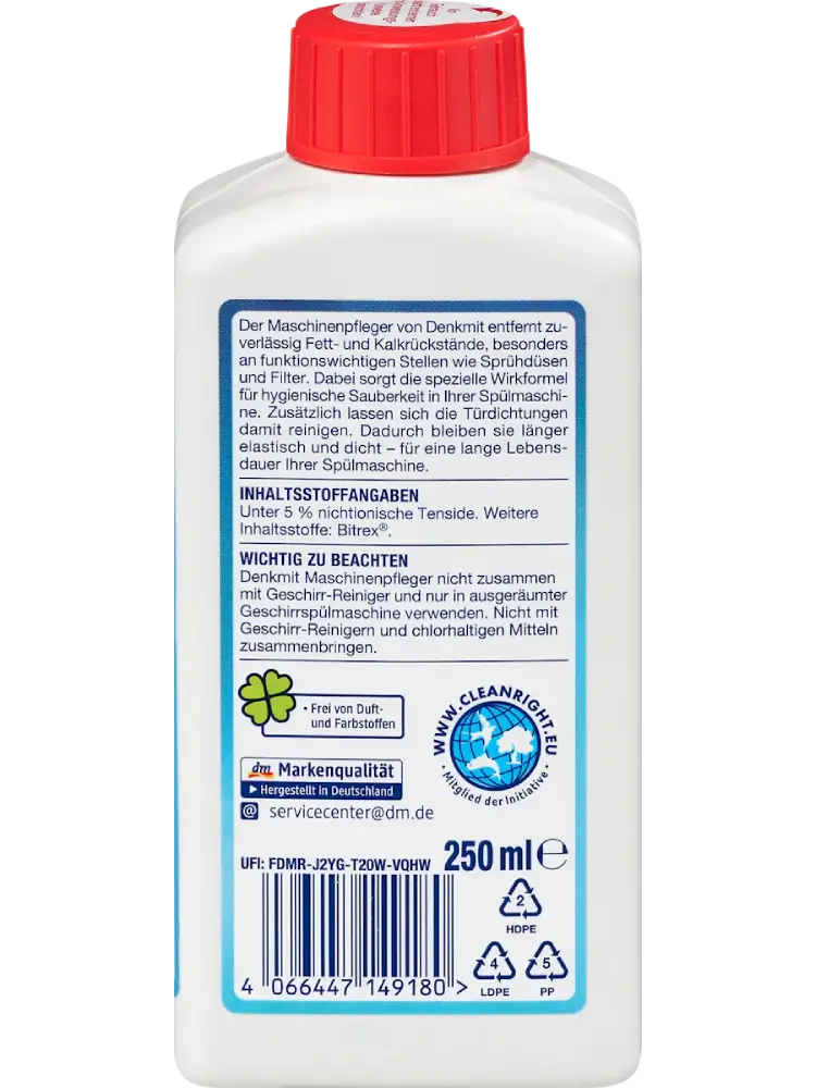 L’entretien machine de Denkmit élimine efficacement les résidus de graisse et de calcaire, en particulier aux endroits fonctionnels importants tels que les buses de pulvérisation et les filtres. Sa formule spéciale assure une propreté hygiénique dans votre lave-vaisselle.