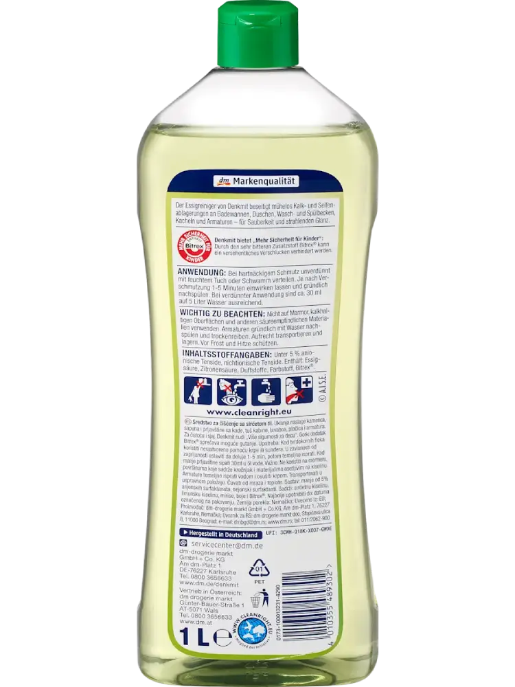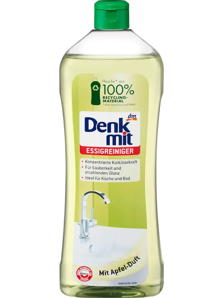 Le nettoyant au vinaigre Denkmit parfum pomme élimine facilement les dépôts de calcaire et de savon sur les baignoires, douches, lavabos, éviers, carrelages et robinetteries — pour une propreté parfaite et une brillance éclatante.