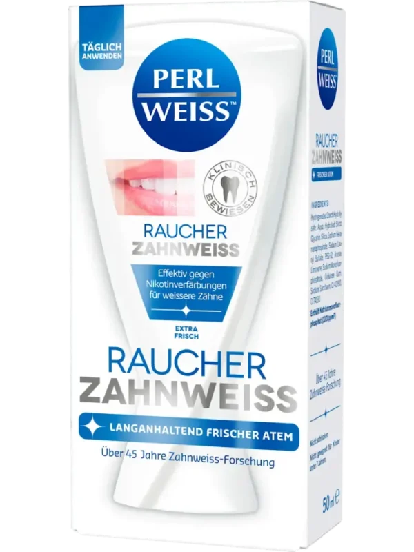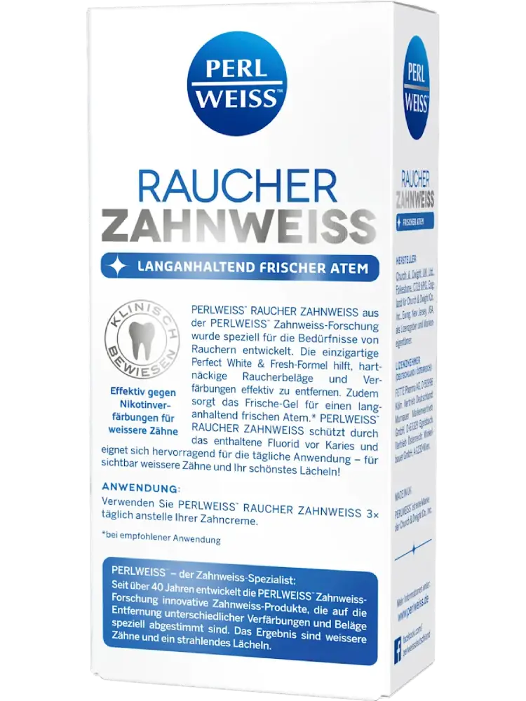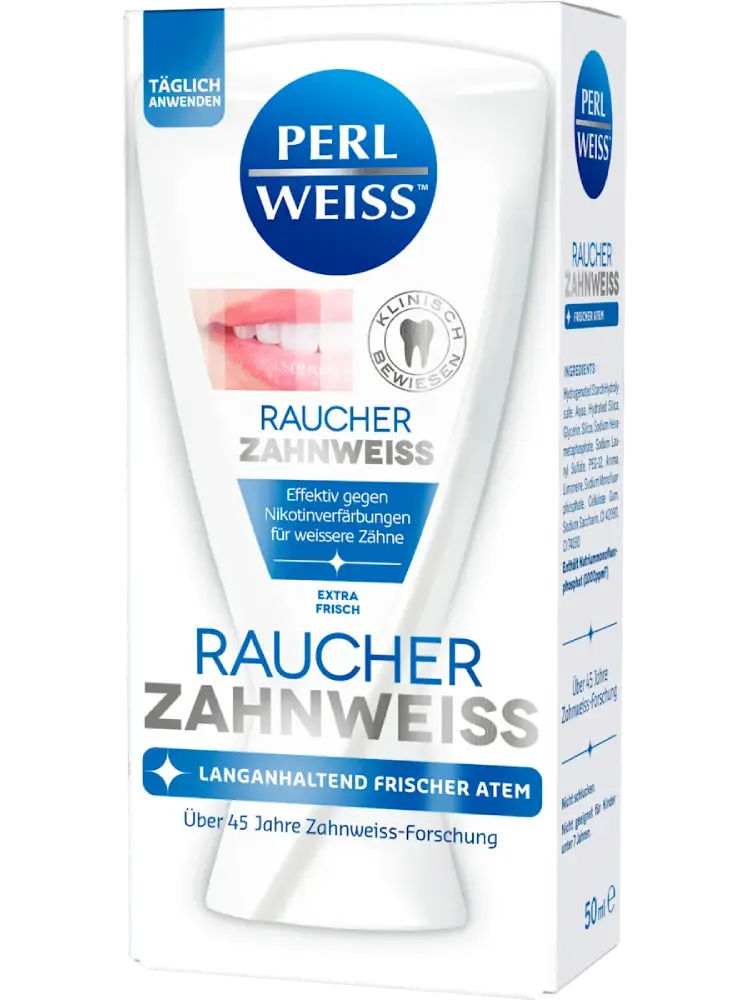 يعمل معجون الأسنان Perlweiss Raucher-Zahnweiß بفعالية على مكافحة التصبغات الناتجة عن النيكوتين عند استخدامه يوميًا، مما يمنح أسنانًا أكثر بياضًا ونفسًا منعشًا يدوم طويلاً.