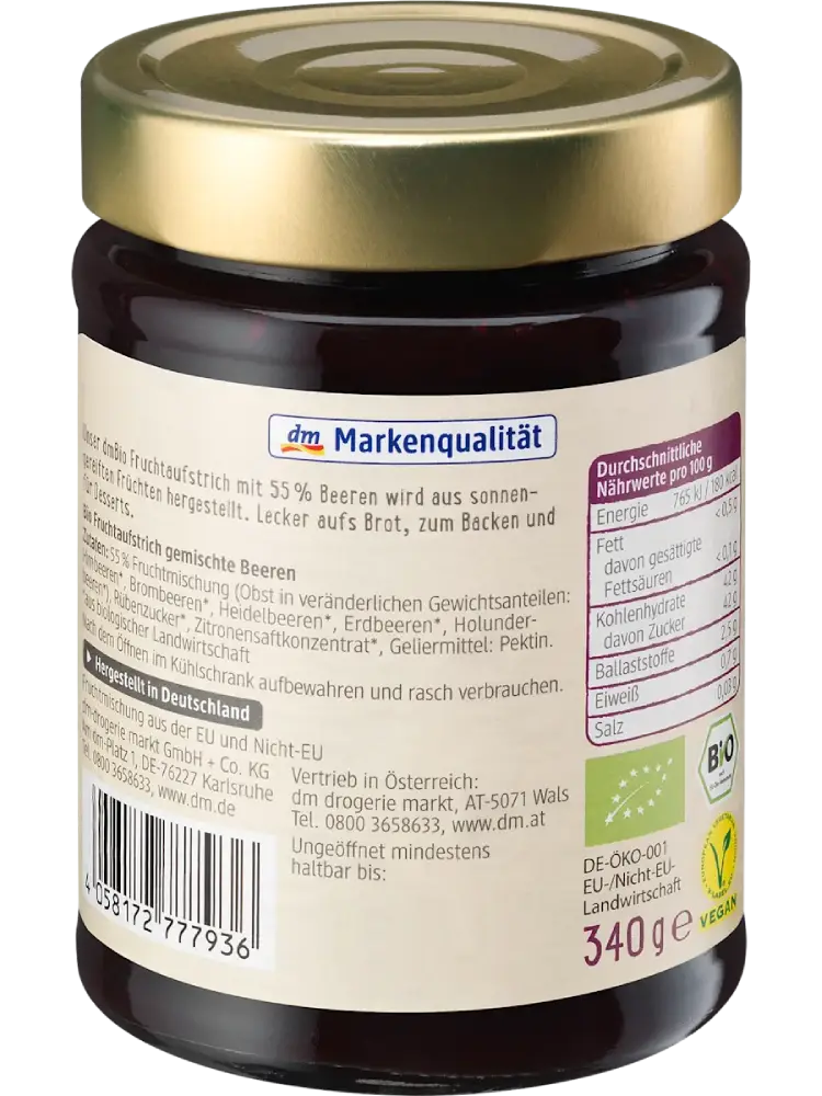 مربى dmBio بنسبة 55٪ من التوت تُحضَّر من فواكه ناضجة تحت أشعة الشمس. لذيذة على الخبز، وللاستخدام في الخَبز أو في تحضير الحلويات.