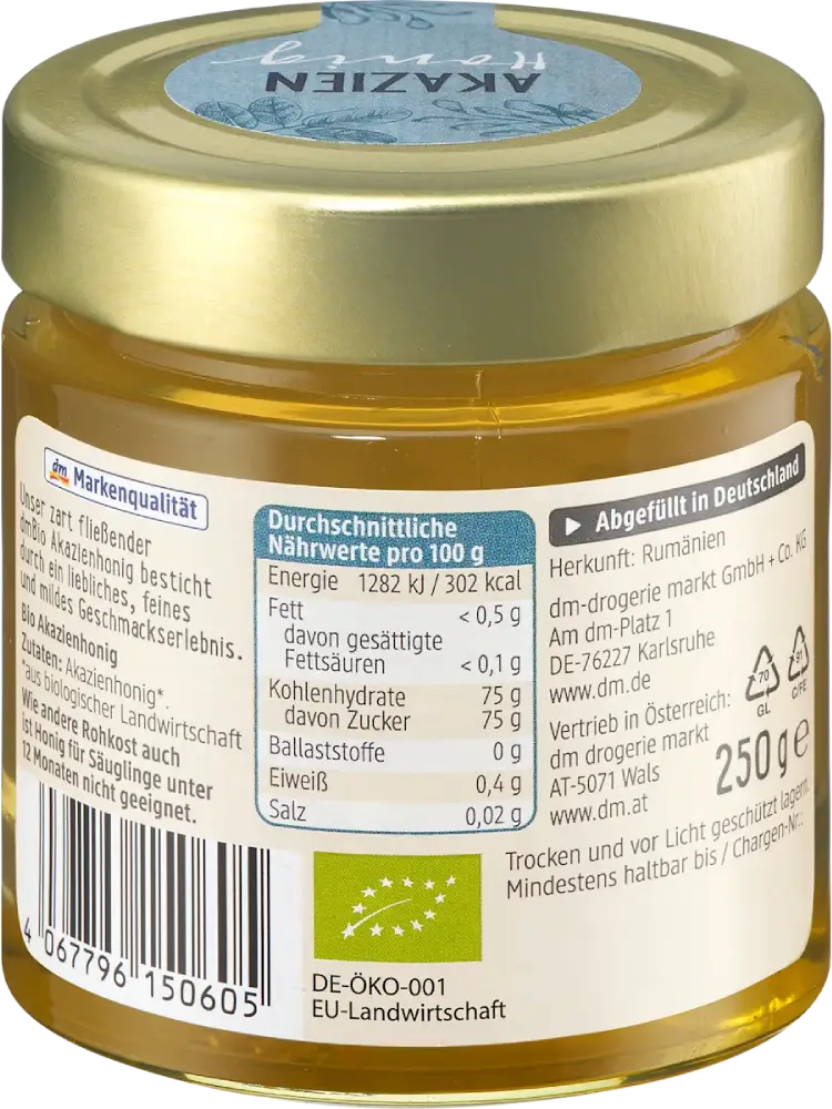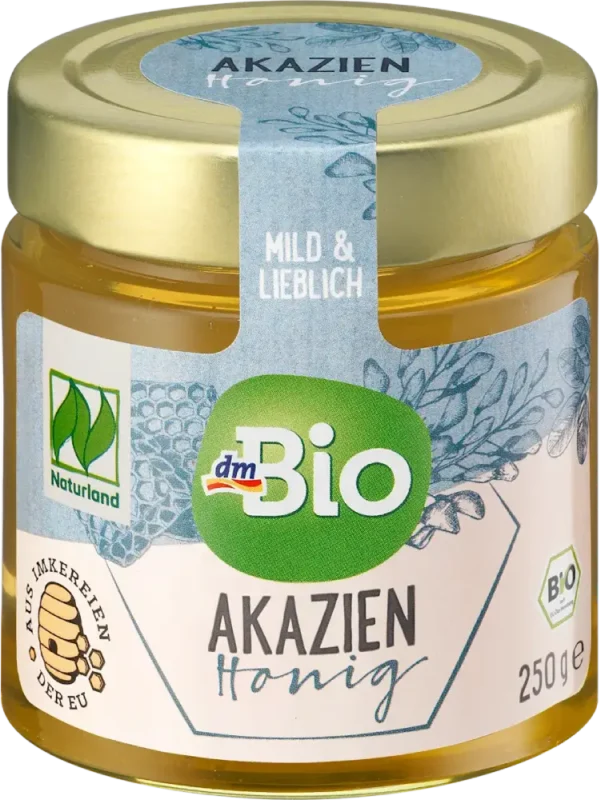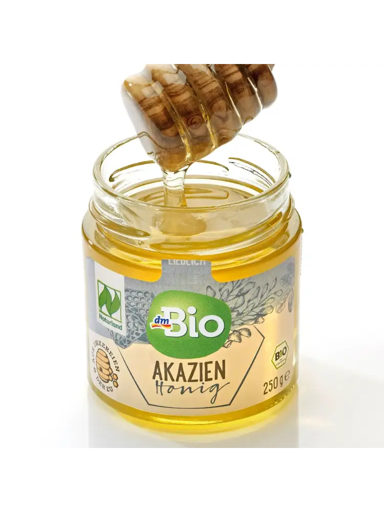 يتميّز عسل الأكاسيا السائل بلطف من dmBio برائحة لا تقاوم وطعم لطيف ودقيق ومعتدل.