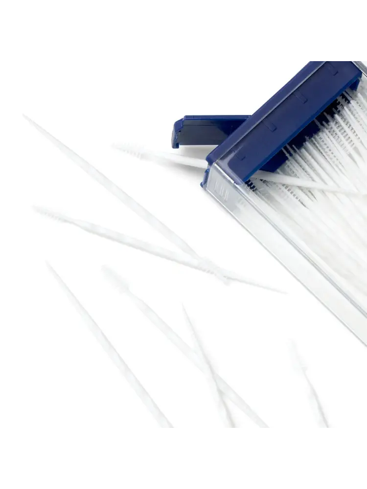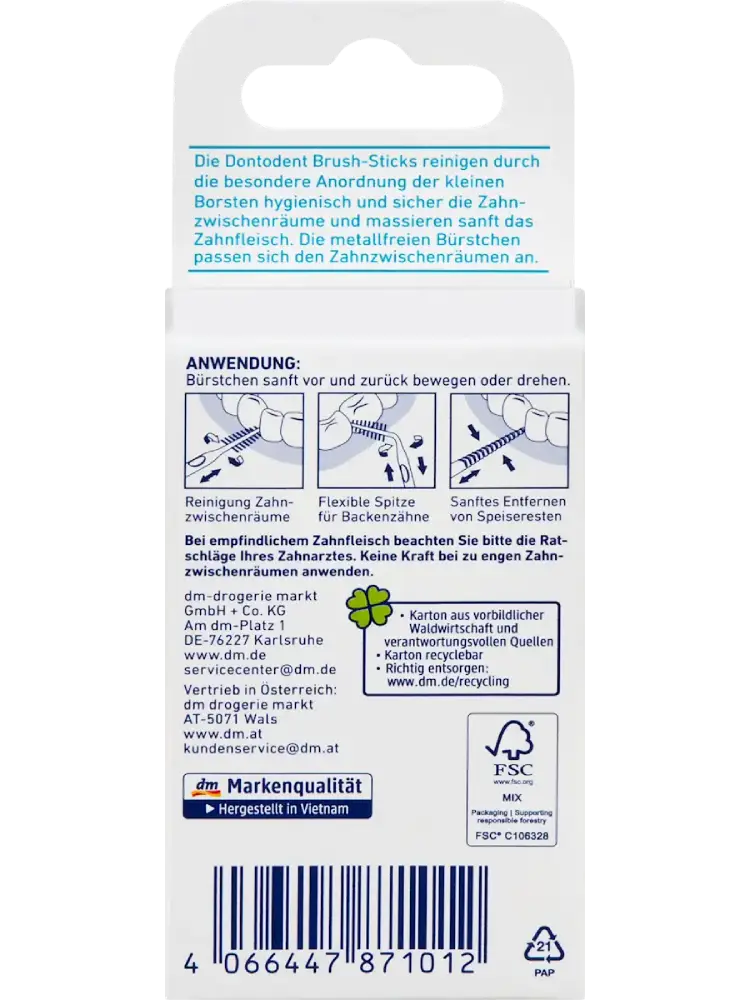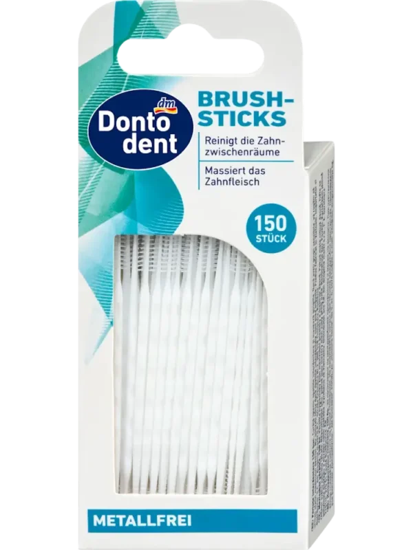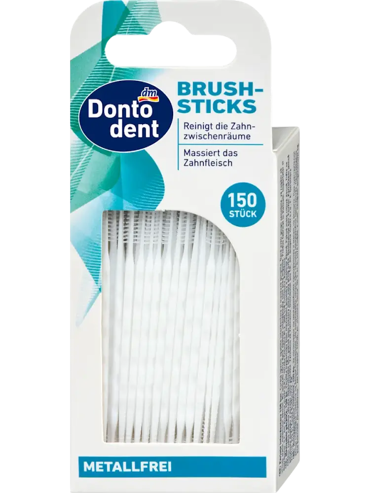 أعواد Brush-Sticks من دونتودِنت خالية من المعدن، تنظف فراغات الأسنان بشكل صحي وآمن بفضل الترتيب الخاص للشعيرات الصغيرة، كما تدلّك اللثة بلطف. الفرش الصغيرة الخالية من المعدن تتكيف مع المسافات بين الأسنان، ورأسها المستدير يحمي اللثة من الإصابات.