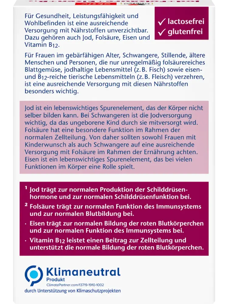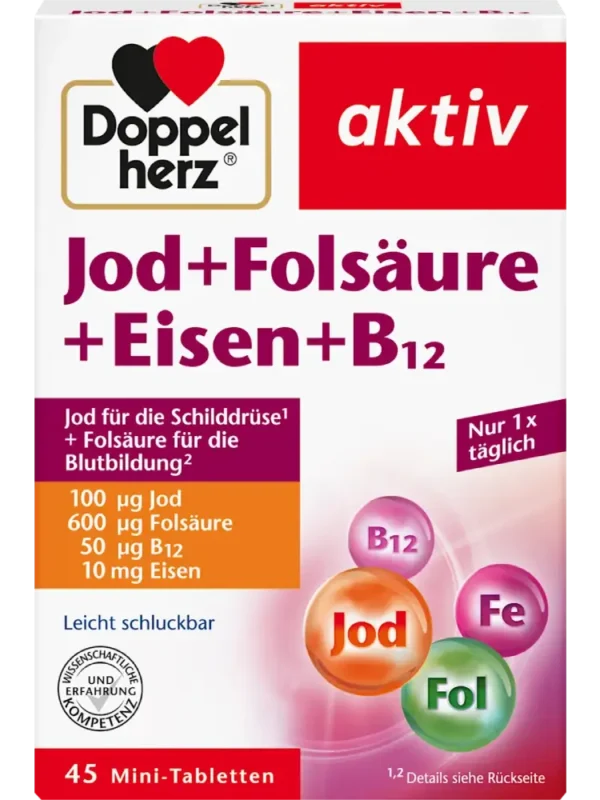 كل ما يحتاجه الجسم: بفضل أقراص اليود + حمض الفوليك + الحديد من Doppelherz. فالحصول على كمية كافية من العناصر الغذائية ضروري للصحة والأداء والشعور بالعافية. وتشمل هذه العناصر أيضًا اليود وحمض الفوليك والحديد وفيتامين B12. ويعد الحصول على كمية كافية من هذه العناصر مهمًا بشكل خاص للنساء في سن الإنجاب، والحوامل، والمرضعات، وكبار السن، وكذلك للأشخاص الذين يتبعون نظامًا غذائيًا غير متوازن.