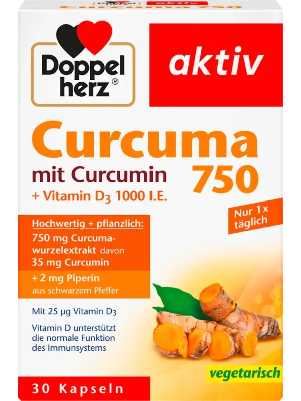 تحتوي كبسولات Curcuma 750 من Doppelherz على 750 ملغ من مستخلص جذور الكركم عالي الجودة (Curcuma longa L.) مع 35 ملغ من الكركمين الطبيعي، بالإضافة إلى 2 ملغ من البيبيرين و 25 ميكروغرام من فيتامين D3 (ما يعادل 1000 وحدة دولية).