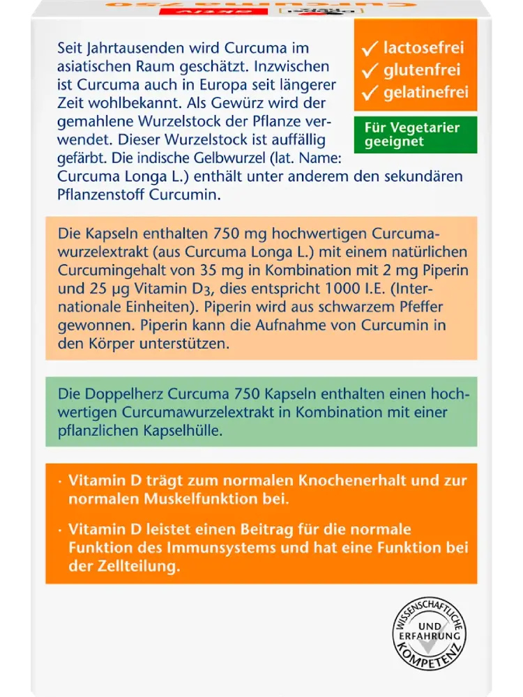 Les gélules Curcuma 750 de Doppelherz contiennent 750 mg d’extrait de racine de curcuma de haute qualité (Curcuma longa L.) avec 35 mg de curcumine naturelle, combinés avec 2 mg de pipérine et 25 µg de vitamine D3 (soit 1000 UI – unités internationales).