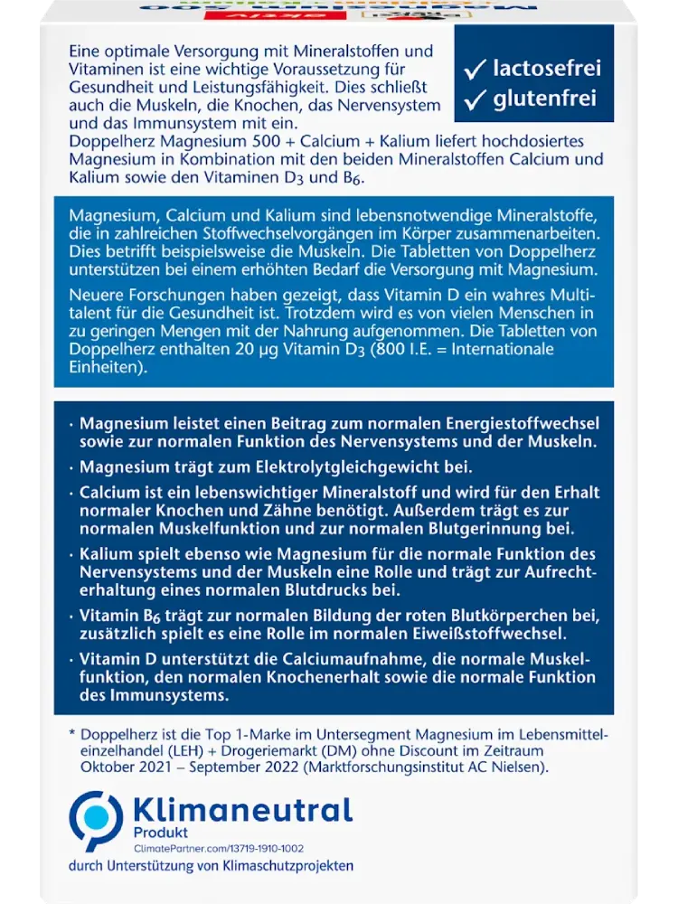 أقراص دوبل هيرتس مغنيسيوم 500 + كالسيوم + بوتاسيوم توفر جرعة عالية من المغنيسيوم مع معدني الكالسيوم والبوتاسيوم بالإضافة إلى فيتاميني D3 وB6. إن الإمداد الأمثل بالمعادن والفيتامينات شرط أساسي للحفاظ على الصحة.