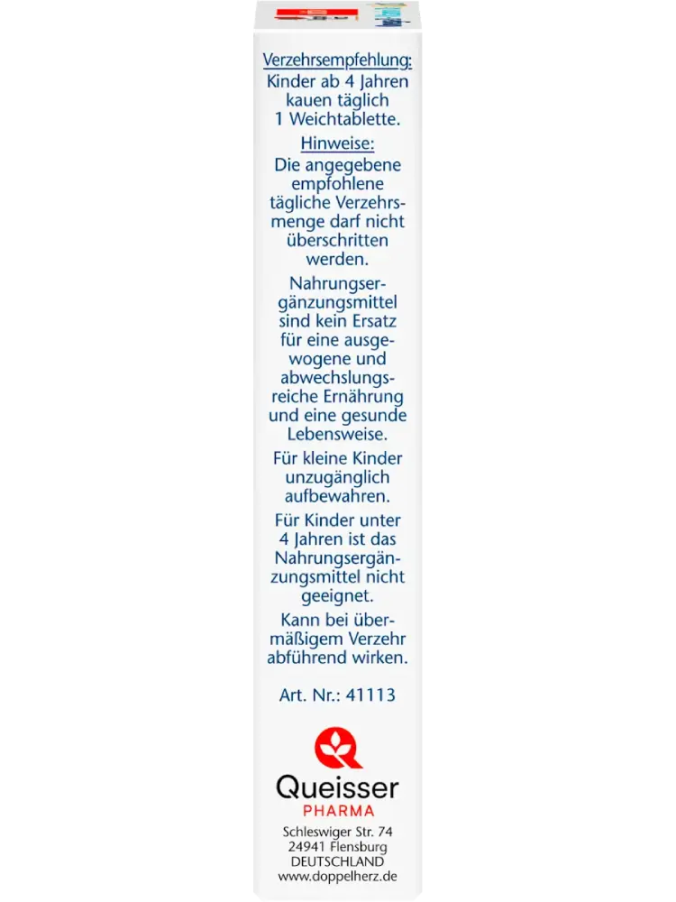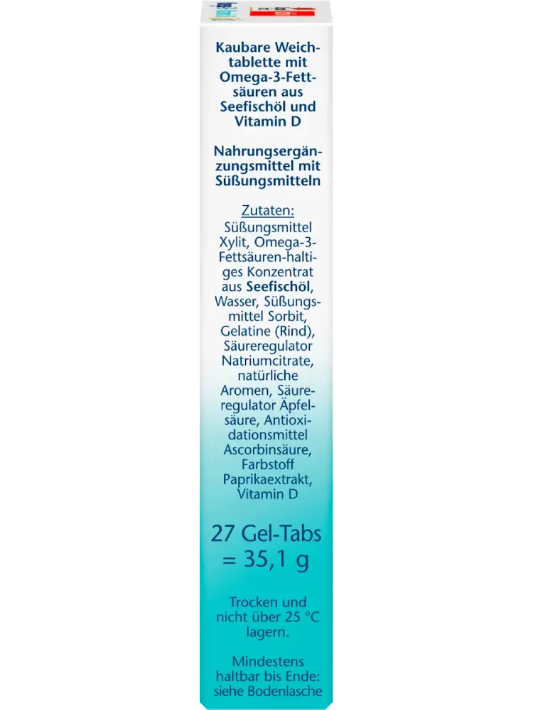 أقراص المضغ أوميغا 3 + فيتامين D3 للأطفال من Doppelherz تحتوي على 180 ملغ من أوميغا 3 بالإضافة إلى فيتامين D3، الذي يمكن أن يدعم الوظيفة الطبيعية لجهاز المناعة والنمو الطبيعي للعظام.