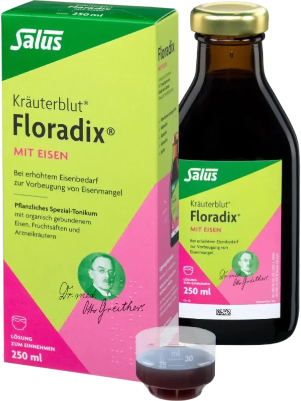 الدواء الطبيعي Kräuterblut Floradix مع الحديد يحتوي على 750 ملغ من الحديد لكل 1000 غرام، وقد تم تطويره من خلال أبحاث مكثفة.