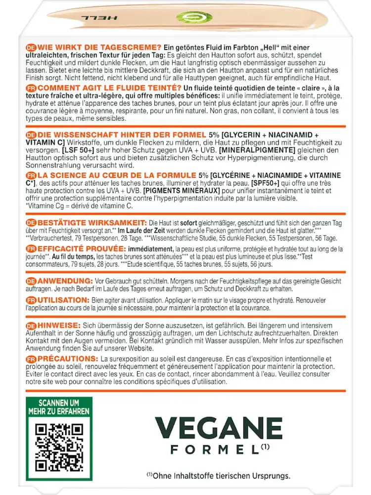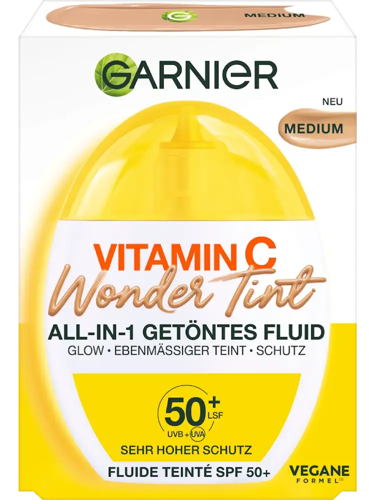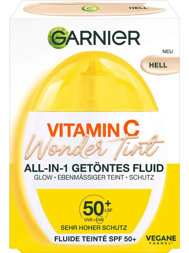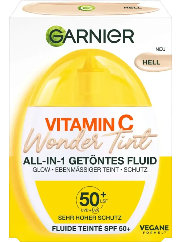 Le fluide clair Vitamin C Wondertint UV SPF 50 de GARNIER donne à la peau un teint éclatant et uniforme. Grâce à sa formule enrichie en vitamine C, niacinamide et 5 % de glycérine, le teint est immédiatement unifié et la peau est hydratée. Avec son indice de protection très élevé SPF 50+, le fluide offre également une protection fiable contre les rayons UVA et UVB. Sa texture ultra légère avec une couvrance légère à moyenne s’adapte au teint, ne graisse pas et assure un fini naturel.