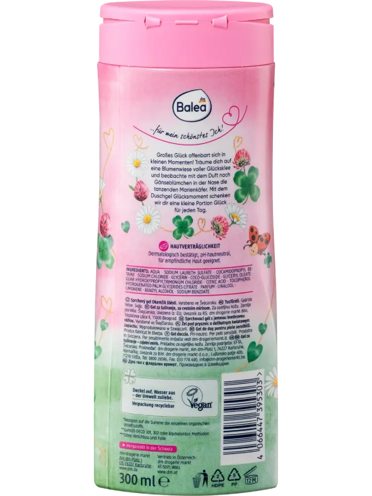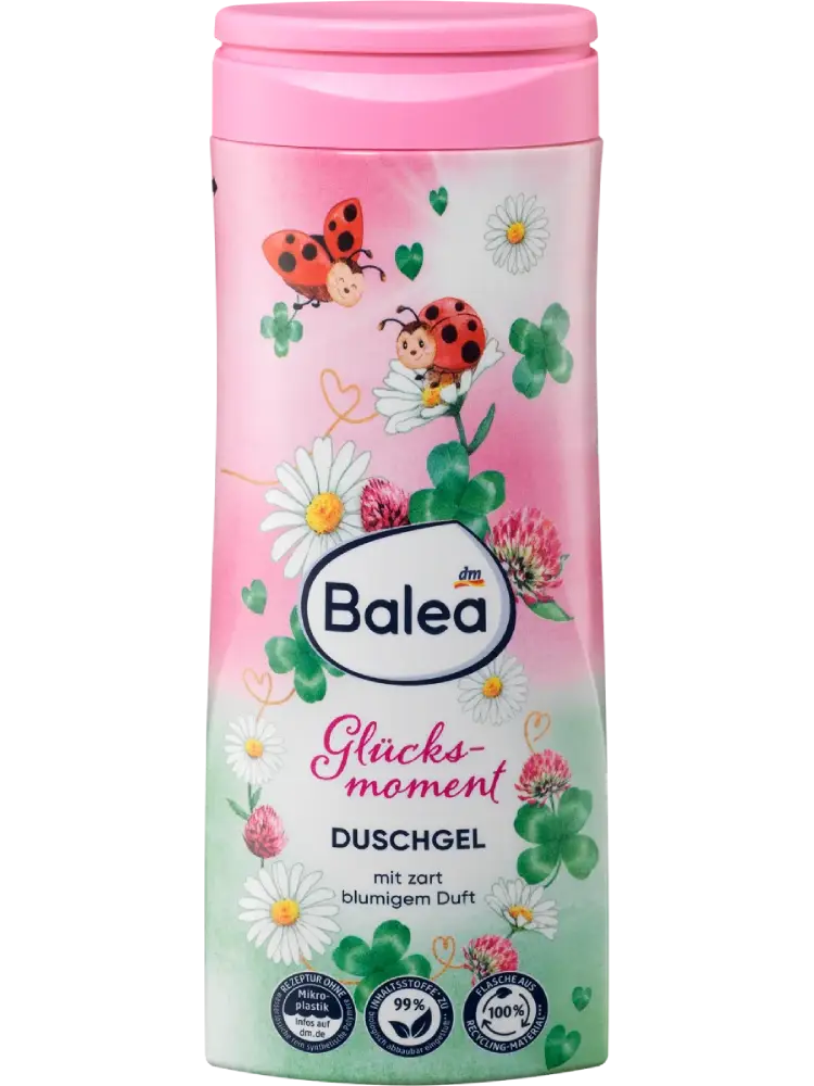 يمنح جل الاستحمام Glücksmoment من Balea برائحته الزهرية إحساسًا ناعمًا على البشرة وتجربة عطرية مميزة. تركيبته اللطيفة تحمي البشرة من الجفاف، وهو مناسب للبشرة الحساسة.