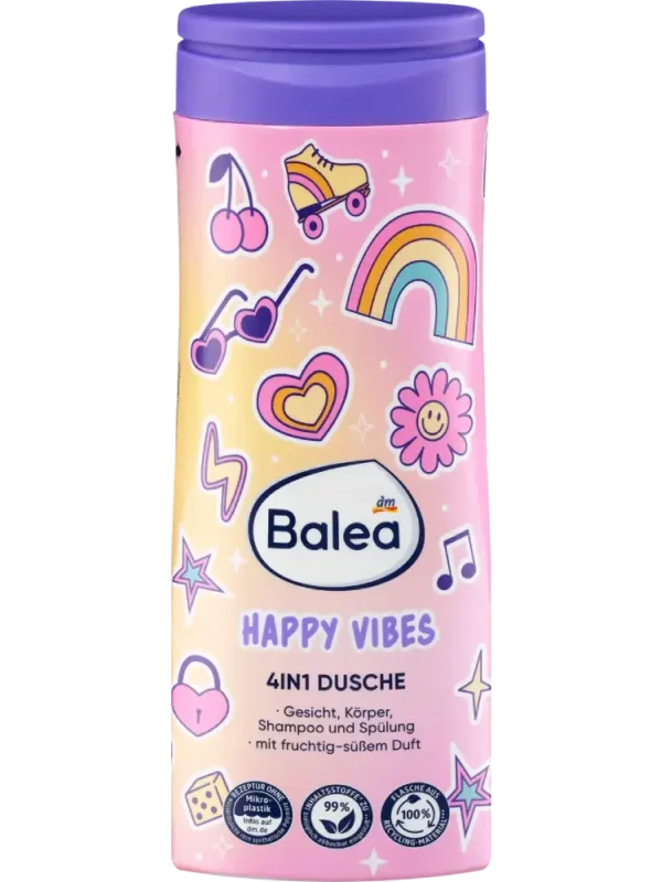 تم تطوير جل الاستحمام للأطفال 4 في 1 Happy Vibes من Balea خصيصًا لتلبية احتياجات بشرة الأطفال. بفضل تركيبته اللطيفة ودرجة حموضته المتوازنة مع البشرة، فهو مناسب لتنظيف الوجه والجسم، كما يعمل كشامبو وبلسم في نفس الوقت. يساعد على تنظيف البشرة والشعر بلطف مع الحفاظ على الترطيب الطبيعي، مما يمنع الجفاف ويمنح إحساسًا ناعمًا ومنتعشًا.