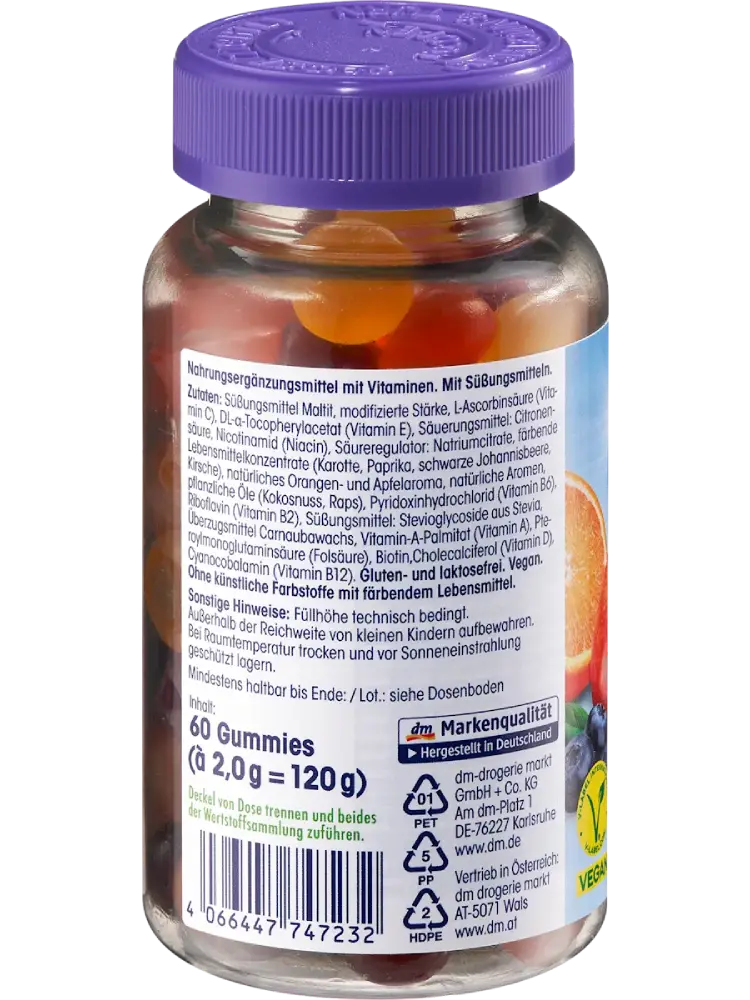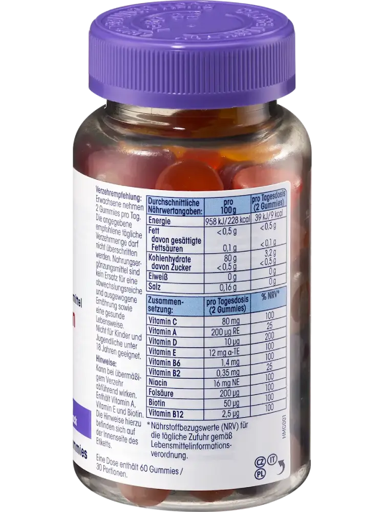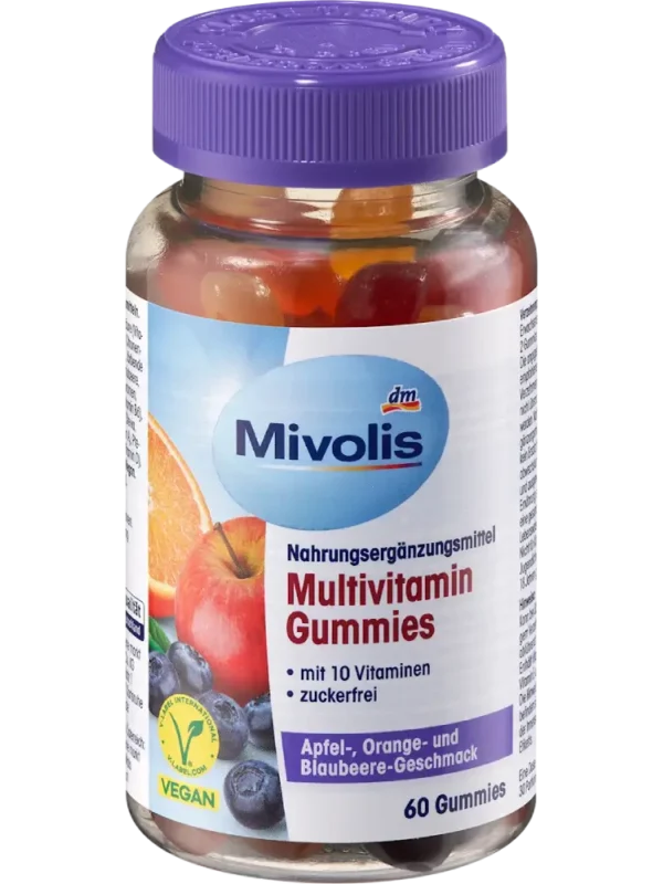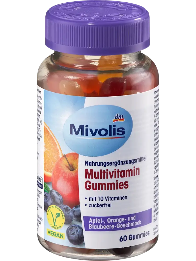 Les gommes multivitaminées Mivolis contiennent 10 vitamines soigneusement sélectionnées et séduisent par leurs délicieuses saveurs de pomme, d’orange et de myrtille. Ces gommes savoureuses sont composées des vitamines A, B2, B6, B12, C, D et E, et contiennent également de la niacine, de la biotine et de l’acide folique.
