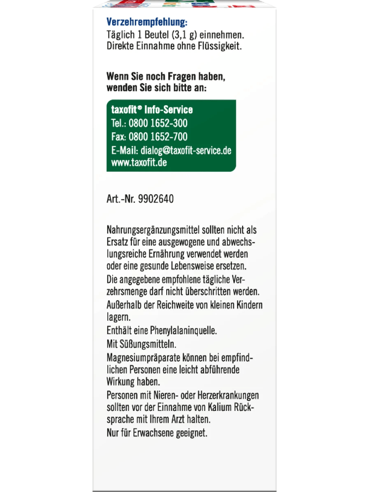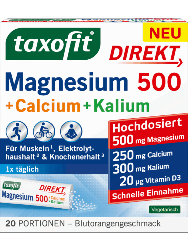 تساعد حبيبات taxofit المباشرة من المغنيسيوم، الكالسيوم والبوتاسيوم في تلبية الحاجة المتزايدة للمغنيسيوم بشكل مثالي. بفضل العصي العملية المعبأة بحصص فردية، يمكن تناول هذا المكمل الغذائي النباتي في أي وقت بدون ماء.