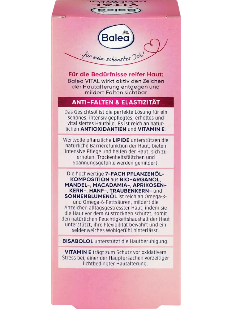 يُعد زيت الوجه Balea VITAL 7-fach الحل المثالي لبشرة جميلة، مغذاة بعمق، مرتاحة ومتجددة. إنه غني بـمضادات الأكسدة الطبيعية وفيتامين E.