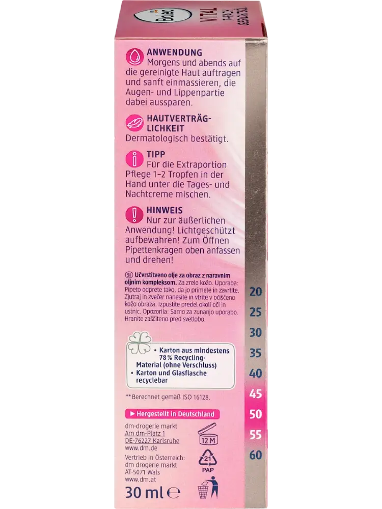L’huile pour le visage Balea VITAL 7-fach est la solution idéale pour une peau belle, intensément nourrie, reposée et revitalisée. Elle est riche en antioxydants naturels et en vitamine E.