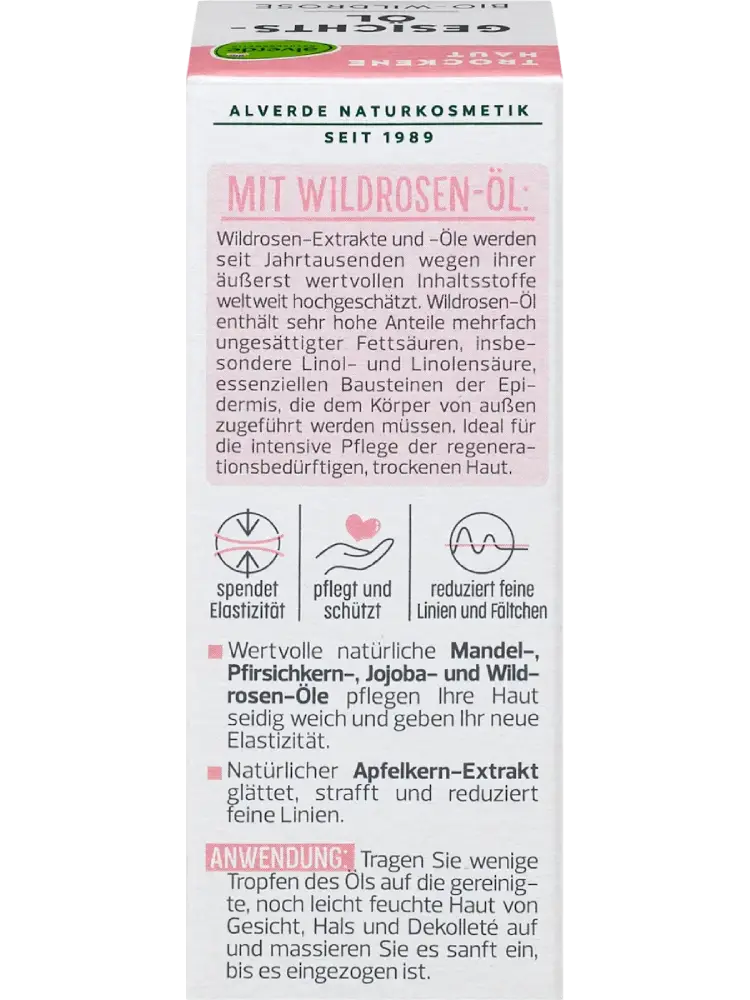 يحتوي زيت الوجه بالورد البري من alverde NATURKOSMETIK على زيوت طبيعية قيمة مثل اللوز، نواة الخوخ، الجوجوبا وزيت الورد البري. تعمل هذه الزيوت على ترطيب البشرة وجعلها ناعمة كالحرير مع تعزيز مرونتها. يعمل مستخلص بذور التفاح الطبيعي على تنعيم وشد البشرة، مما قد يقلل من الخطوط الدقيقة. تركيبة خالية من المواد البلاستيكية الدقيقة والبوليمرات الاصطناعية القابلة للذوبان في الماء.
