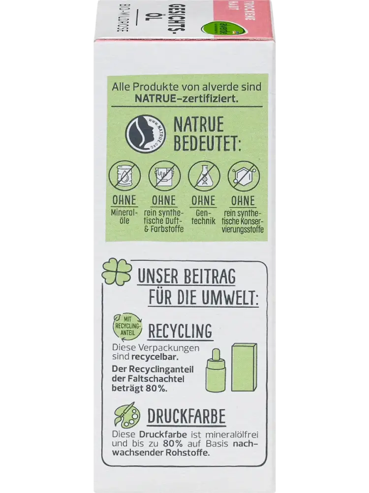 L’huile visage à la rose sauvage alverde NATURKOSMETIK contient des huiles précieuses et naturelles d’amande, de noyau de pêche, de jojoba et de rose sauvage. Ces huiles rendent la peau douce comme de la soie et lui apportent une nouvelle élasticité. L’extrait naturel de pépin de pomme qu’elle contient lisse et raffermit la peau, réduisant ainsi les ridules. Formule sans microplastiques ni polymères synthétiques hydrosolubles.