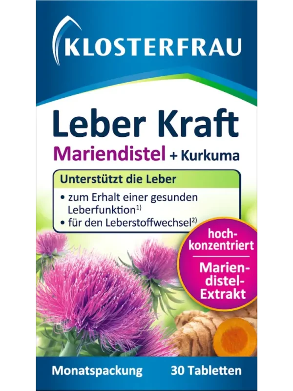مع Klosterfrau Leber Kraft يمكنك دعم وظيفة الكبد بطريقة طبيعية ولطيفة. يحتوي المنتج على مزيج مختار بعناية من جذر الكركم وثمار شوك الحليب بالإضافة إلى المغذيات الدقيقة الكولين وحمض الفوليك، ويحتوي أيضًا على 65 ملغ من السيليمارين (مركب نباتي نشط للكبد) يوميًا.