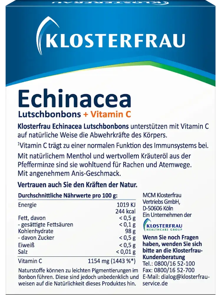 تحتوي حلوى المصّ كلوستر فراو بالإشناسيا على فيتامين C وزيوت عشبية قيّمة. وهي خالية من السكريات المضافة. يساهم فيتامين C بشكل طبيعي في دعم مناعة الجسم. حلوى المصّ بالإشناسيا من كلوستر فراو مناسبة للنباتيين (فيغان).