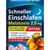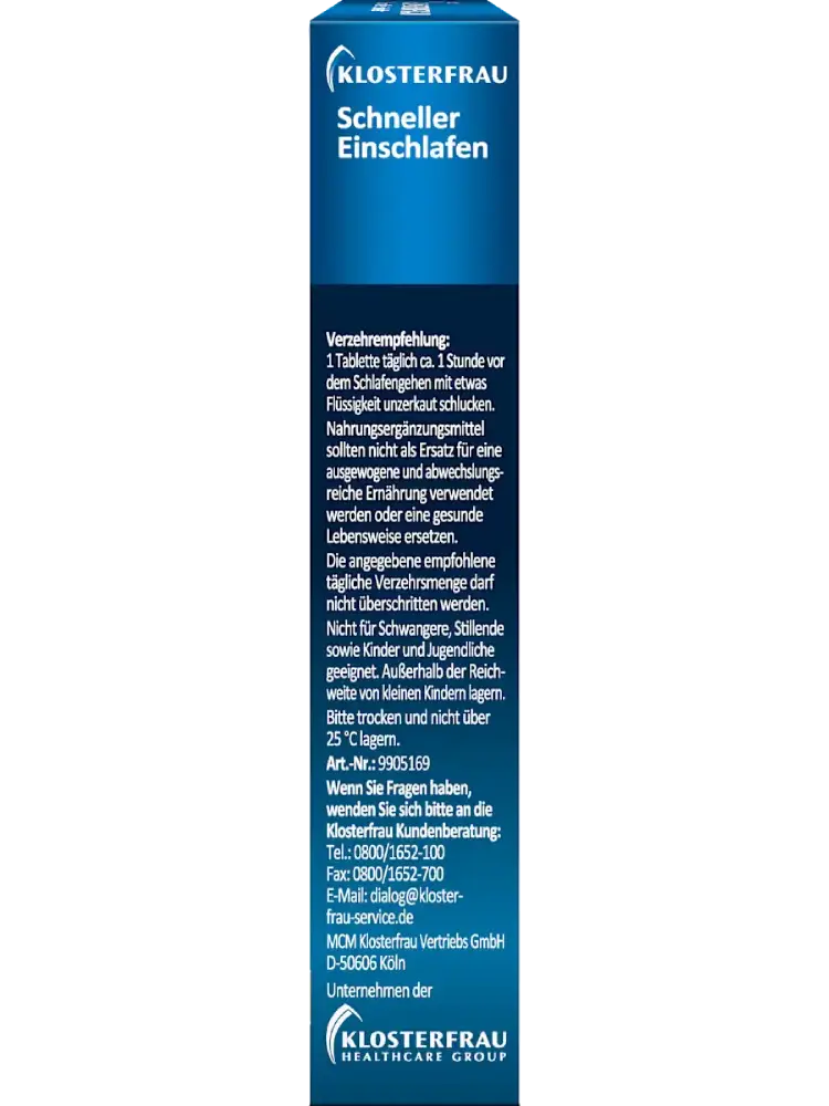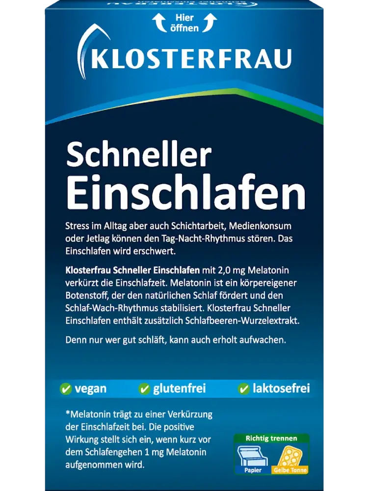 Les comprimés Schneller Einschlafen de Klosterfrau contiennent 2,0 mg de mélatonine ainsi qu’un extrait de racine de withania (plante du sommeil). De plus, la mélatonine peut contribuer à réduire le temps d’endormissement* et avoir un effet positif sur le rythme veille-sommeil en cas de décalage horaire**.