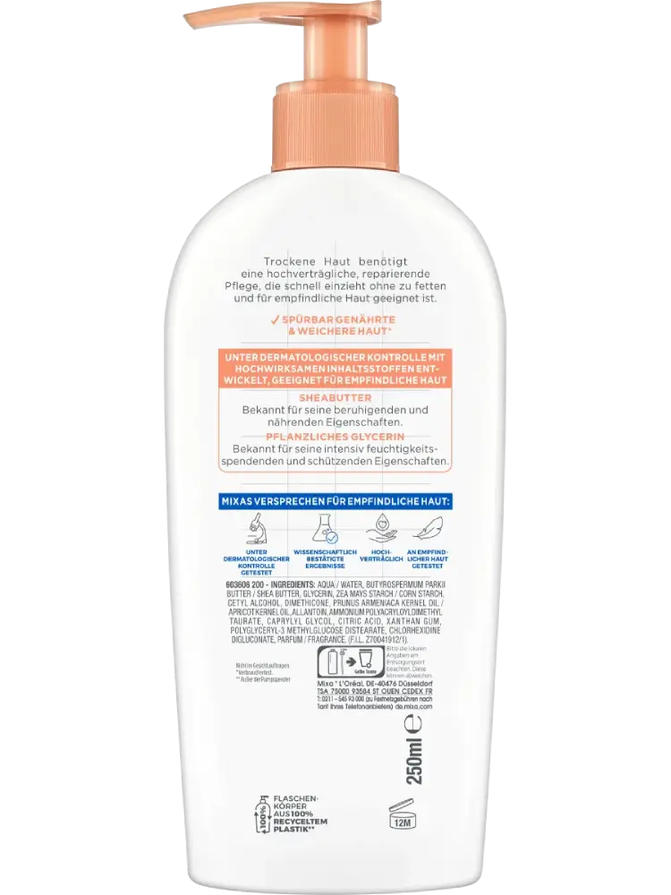 Le lait corporel Mixa Shea Ultra Soft est particulièrement adapté aux peaux sèches et peu hydratées. Il nourrit et hydrate la peau pendant 48 heures. Grâce à des ingrédients hautement tolérés, il est particulièrement doux pour la peau. La glycérine végétale procure une hydratation durable et intense, tandis que le beurre de karité préserve la barrière cutanée contre la perte d’hydratation, prévenant ainsi les sensations de tiraillement et les zones squameuses. Sa texture douce pénètre rapidement, s’applique facilement et ne laisse pas de film gras.