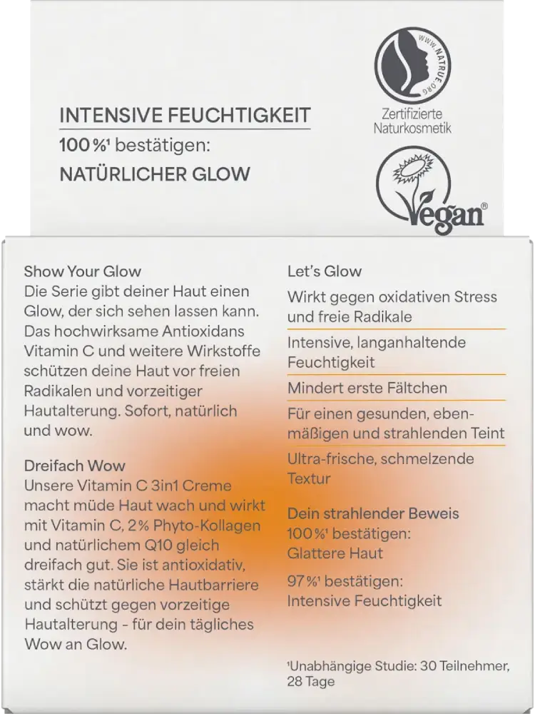 La crème visage Glow By Nature Vitamine C de lavera NATURKOSMETIK allie soin et protection dans une texture ultra fraîche. Grâce au Q10 naturel et à la vitamine C, elle peut aider à réduire les rides et à protéger la peau contre les dommages oxydatifs. Le phyto-collagène apporte une hydratation intense et forme un film protecteur qui renforce la barrière cutanée. L’action antioxydante de la vitamine C aide la peau à lutter contre les radicaux libres et à prévenir le vieillissement prématuré. Pour une peau éclatante, protégée et soignée – jour après jour.