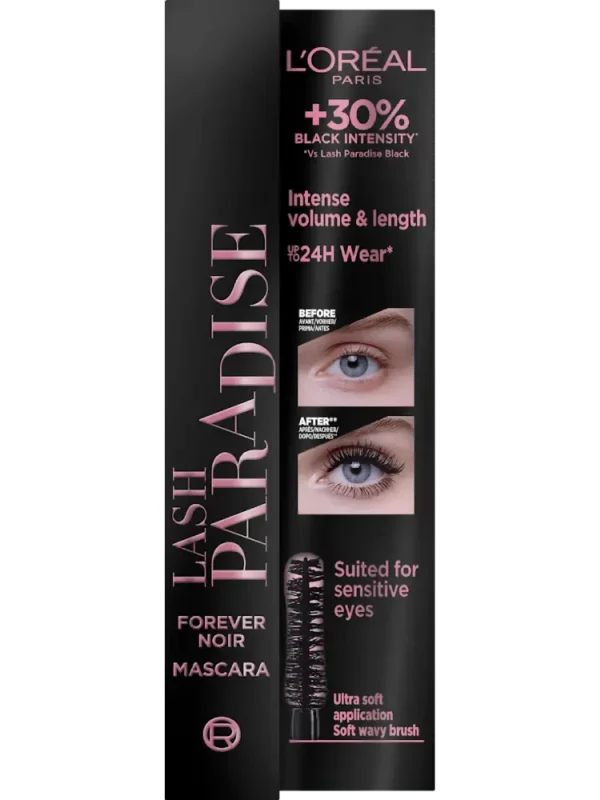 تمنح ماسكارا Lash Paradise Forever Noir من L’Oréal Paris الرموش حجمًا يصل إلى 3 أضعاف. بفضل الفرشاة المنحنية المكثفة للحجم يتم فصل الرموش بشكل مثالي وتغليفها بلون أسود عميق.