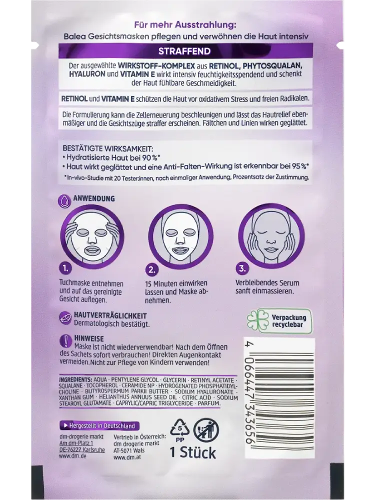 Le masque en tissu au rétinol Balea, avec un complexe d’ingrédients actifs sélectionnés comprenant du rétinol, du phytosqualane, de l’acide hyaluronique et de la vitamine E, procure une hydratation intense et rend la peau visiblement plus douce. Le rétinol et la vitamine E protègent la peau contre le stress oxydatif et les radicaux libres. La formulation peut accélérer le renouvellement cellulaire et rendre le grain de peau plus uniforme tout en raffermissant les traits du visage. Les rides et les ridules paraissent lissées. Formule sans microplastiques ni polymères synthétiques hydrosolubles.