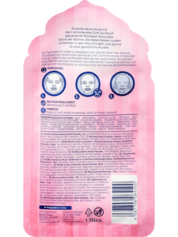 Le masque en tissu Sweet Pancake de Balea contient de l’extrait de beurre de cacao, de l’extrait de myrtille et de l’acide hyaluronique. Il hydrate intensément la peau tout en laissant un agréable parfum sucré et chocolaté. Son tissu épouse parfaitement les contours du visage, permettant une absorption optimale des actifs.