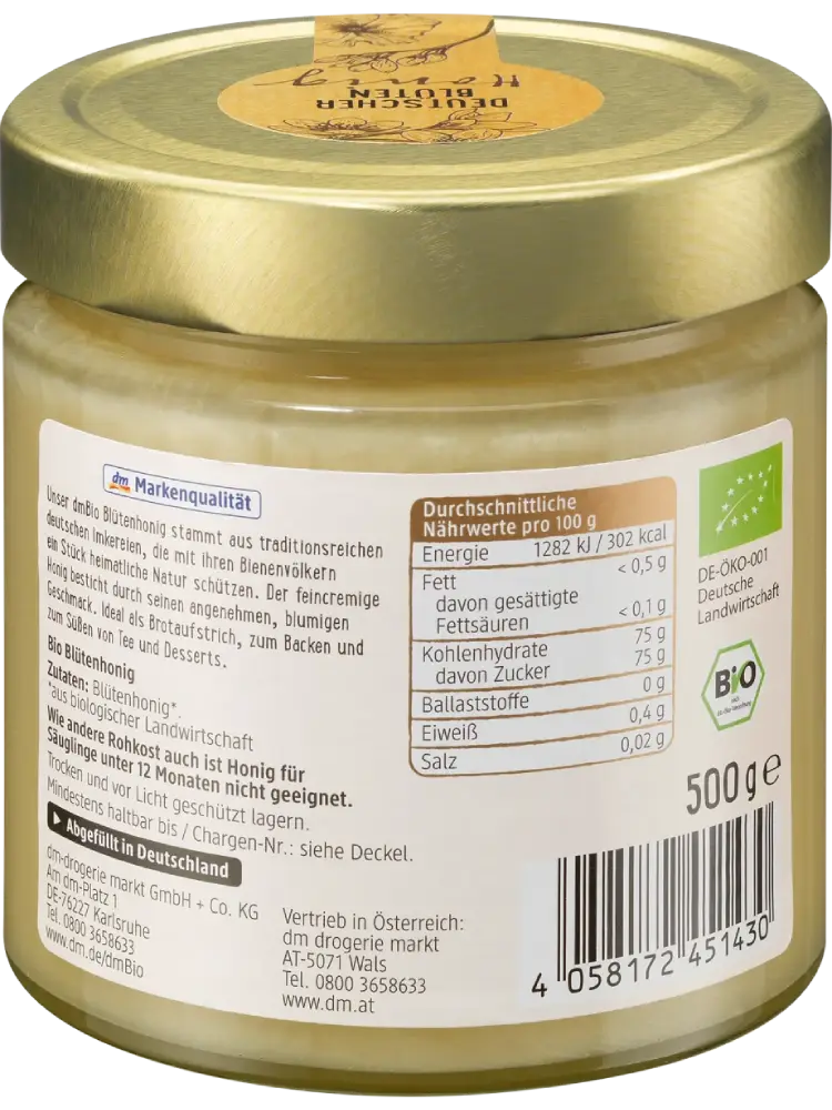 Notre miel de fleurs dmBio provient d’apiculteurs allemands traditionnels qui, avec leurs colonies d’abeilles, contribuent à la préservation de la nature locale. Ce miel délicieusement crémeux séduit par son goût agréable et floral. Idéal comme tartinable, pour la pâtisserie et pour sucrer le thé et les desserts.