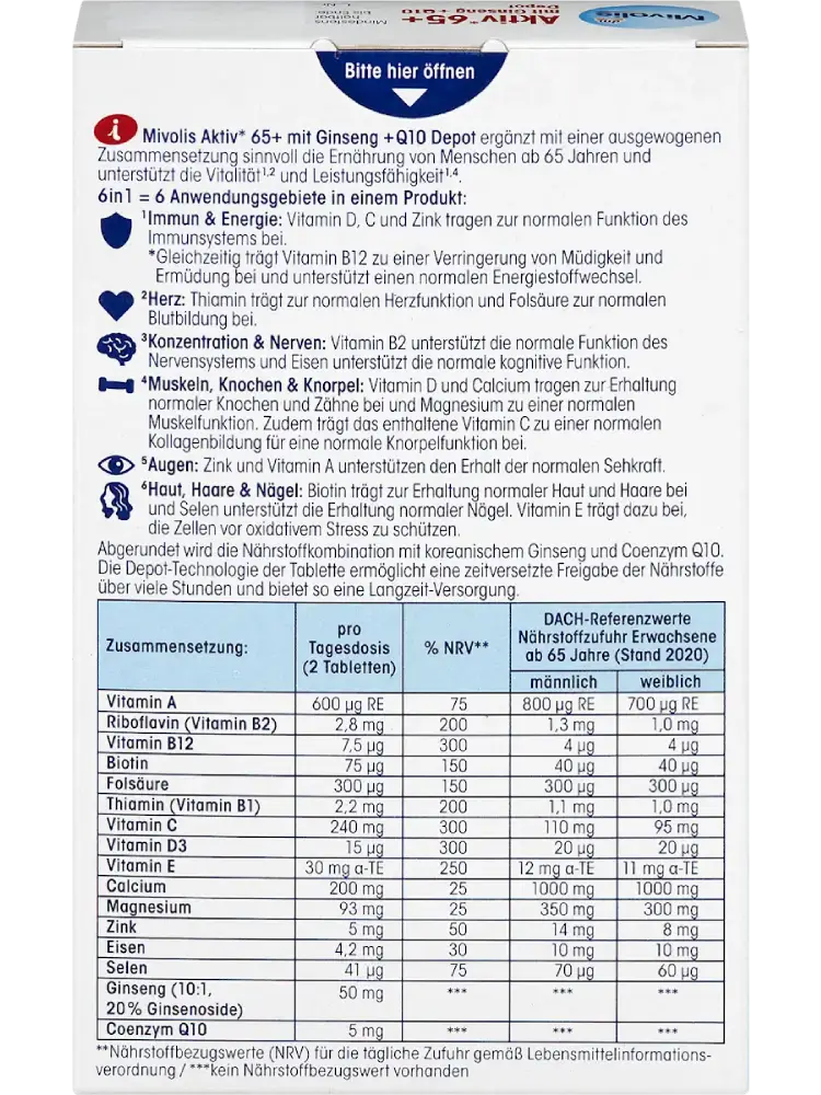 Mivolis Aktiv 65+ avec ginseng + Q10 dépôt complète de manière pertinente l’alimentation des personnes de plus de 65 ans grâce à une composition équilibrée et soutient la vitalité¹⁺² et la performance¹⁺².