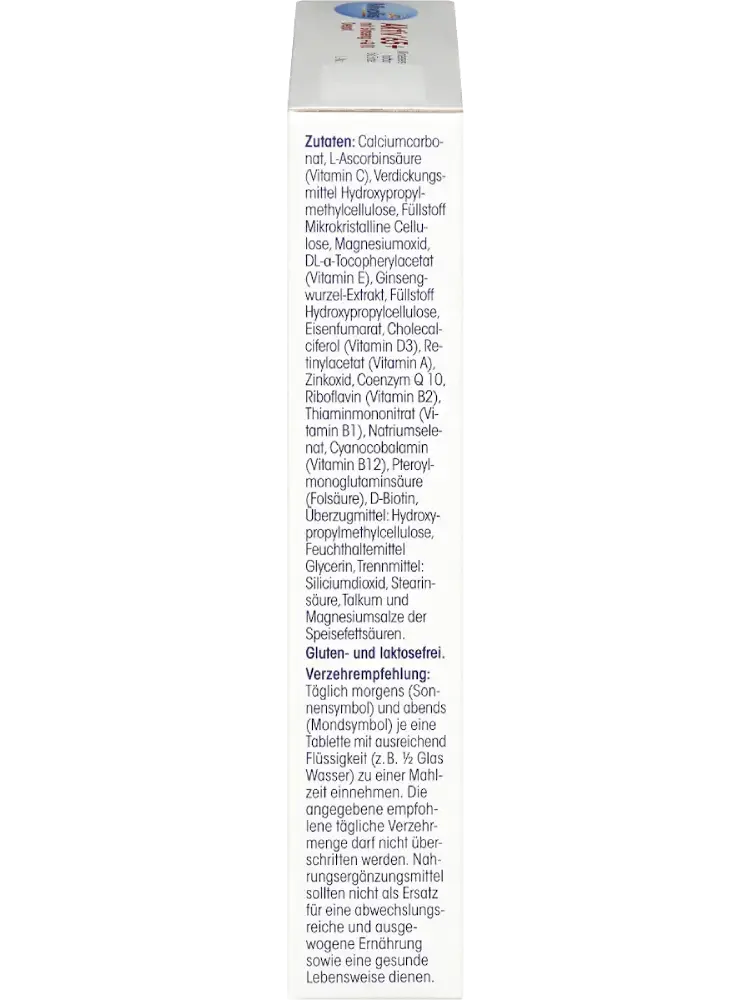 La combinaison nutritionnelle est complétée par du ginseng coréen et du coenzyme Q10. La technologie dépôt des comprimés permet une libération progressive des nutriments sur plusieurs heures, offrant ainsi un apport prolongé.