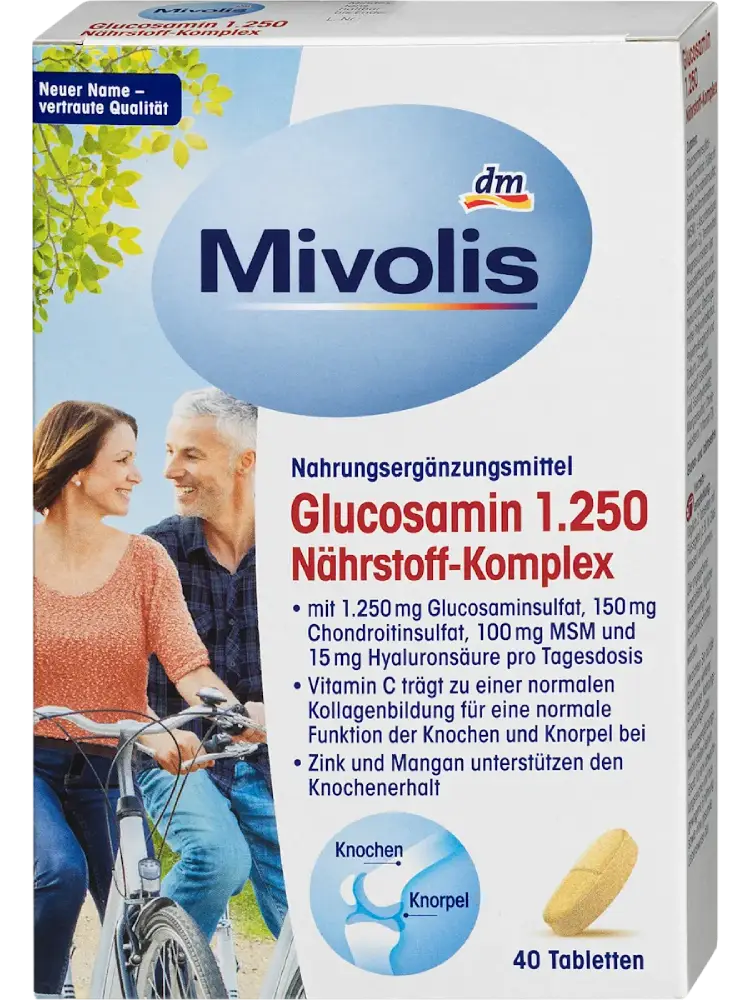 يمكن أن يساعد مركب الغلوكوزامين 1250 الغذائي من Mivolis الجسم في الحياة اليومية. فالجهاز الحركي لدى الإنسان يتعرض يوميًا للضغط والإجهاد. وليس فقط لدى كبار السن، بل حتى لدى الشباب يمكن أن تتعرض العظام والغضاريف والأنسجة الضامة لضغط كبير بسبب العمل أو بعض الأنشطة الرياضية أو زيادة الوزن. في مثل هذه الحالات قد يكون من المفيد تزويد الجسم ببعض العناصر الغذائية بشكل إضافي.