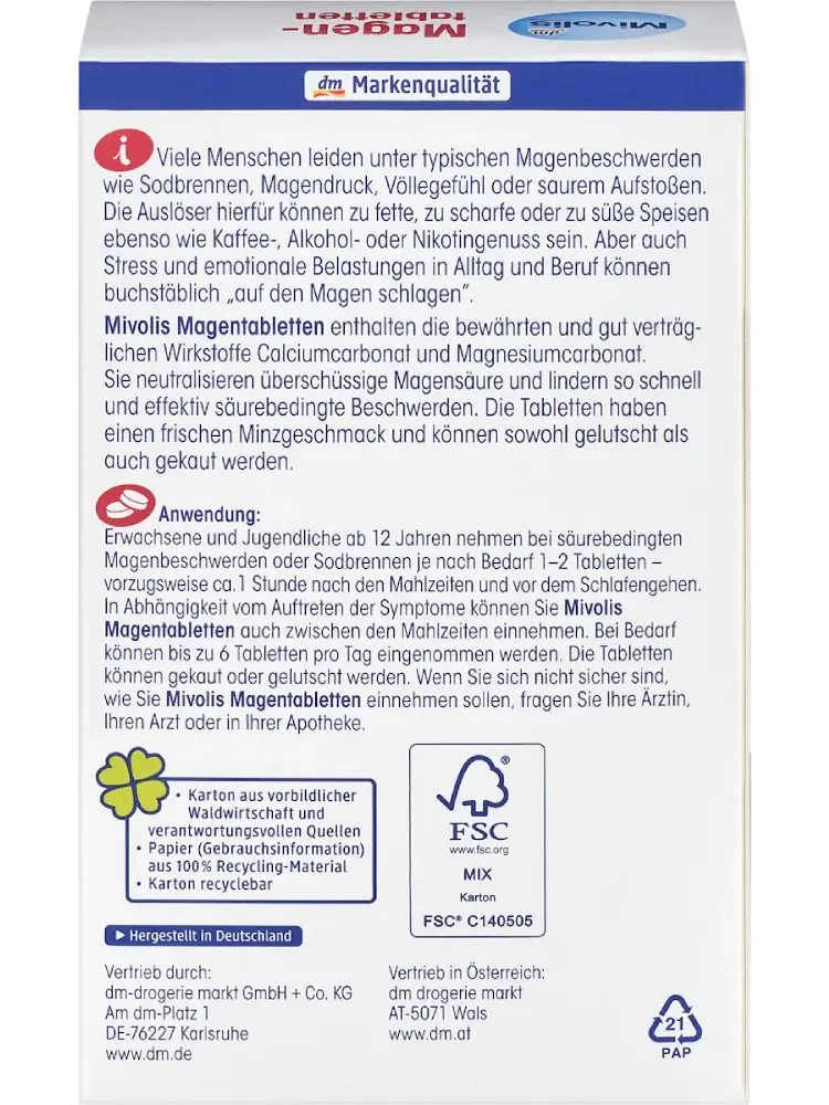 Les comprimés pour l’estomac Mivolis contiennent des principes actifs éprouvés et bien tolérés : le carbonate de calcium et le carbonate de magnésium.
