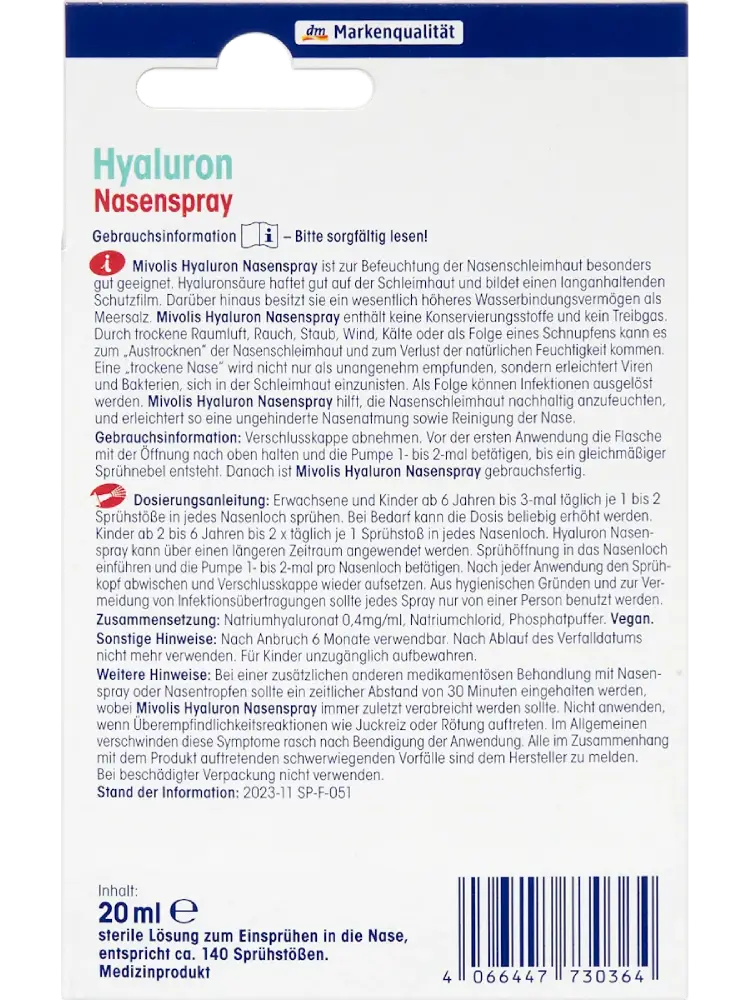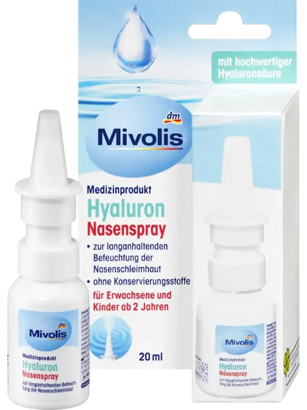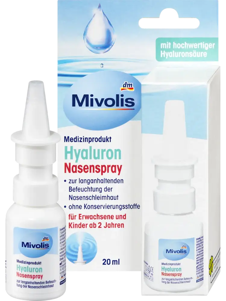 يُعد بخاخ الأنف بحمض الهيالورونيك من Mivolis مناسبًا جدًا لترطيب الغشاء المخاطي للأنف. يلتصق حمض الهيالورونيك جيدًا بالغشاء المخاطي ويكوّن طبقة حماية تدوم لفترة طويلة. كما يتميز بقدرة أعلى بكثير على الاحتفاظ بالماء مقارنة بملح البحر.