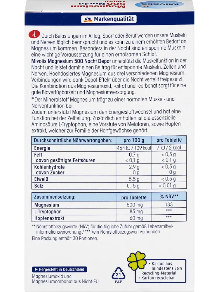 Les exigences de la vie quotidienne, du sport ou du travail sollicitent continuellement nos muscles et nos nerfs, entraînant parfois un besoin accru en magnésium.Surtout la nuit, des muscles détendus sont essentiels pour un sommeil réparateur.Mivolis Magnésium 500 Nuit Depot soutient la fonction musculaire pendant la nuit et contribue à la détente des muscles, des cellules et des nerfs.Le magnésium fortement dosé, issu de trois formes différentes (oxyde, citrate et carbonate), est libéré progressivement grâce à l’effet depot, assurant une bonne biodisponibilité.*Le magnésium contribue à une fonction musculaire et nerveuse normale, soutient le métabolisme énergétique et joue un rôle dans le processus de division cellulaire.Contient également l’acide aminé essentiel L-tryptophane, précurseur de la mélatonine, ainsi qu’un extrait de houblon, appartenant à la famille des cannabinacées.