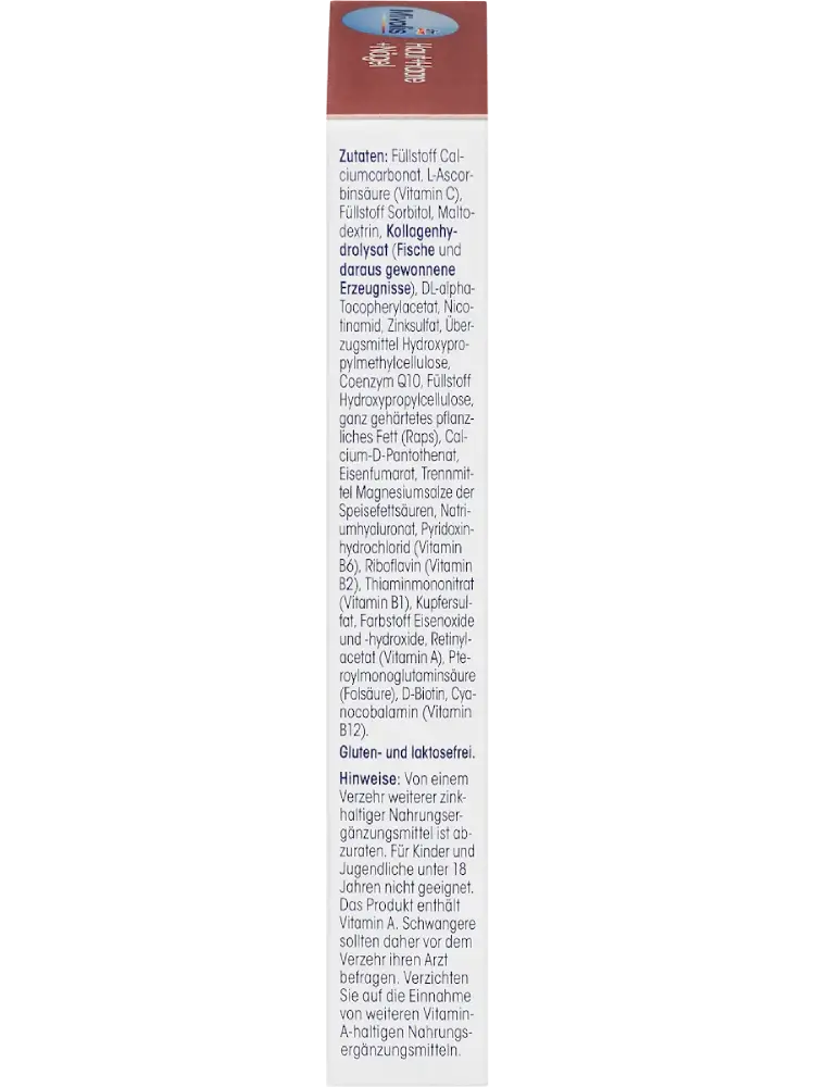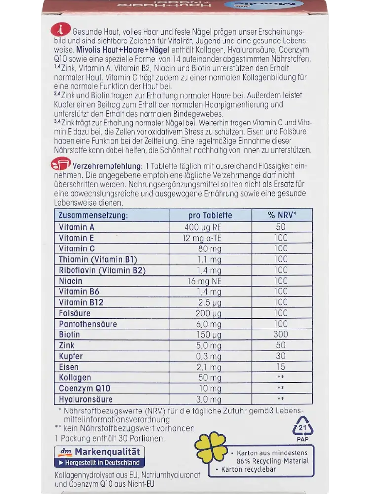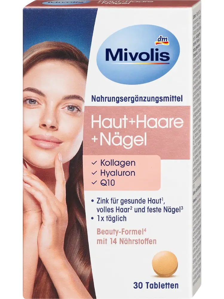 Une peau saine, des cheveux fournis et des ongles solides marquent l’apparence et sont des signes visibles de vitalité, de jeunesse et d’un mode de vie sain. Mivolis Peau + Cheveux + Ongles contient du collagène, de l’acide hyaluronique, du coenzyme Q10 ainsi qu’une formule spéciale de 14 nutriments complémentaires. Le zinc, la vitamine A, la vitamine B2, la niacine et la biotine contribuent au maintien d’une peau normale. La vitamine C contribue également à une formation normale de collagène pour une fonction cutanée normale. Le zinc et la biotine participent au maintien de cheveux normaux. De plus, le cuivre contribue au maintien d’une pigmentation normale des cheveux et au maintien du tissu conjonctif normal. Le zinc contribue au maintien d’ongles normaux. Enfin, les vitamines C et E aident à protéger les cellules contre le stress oxydatif. Le fer et l’acide folique jouent un rôle dans la division cellulaire. Une prise régulière de ces nutriments peut aider à soutenir durablement la beauté de l’intérieur.