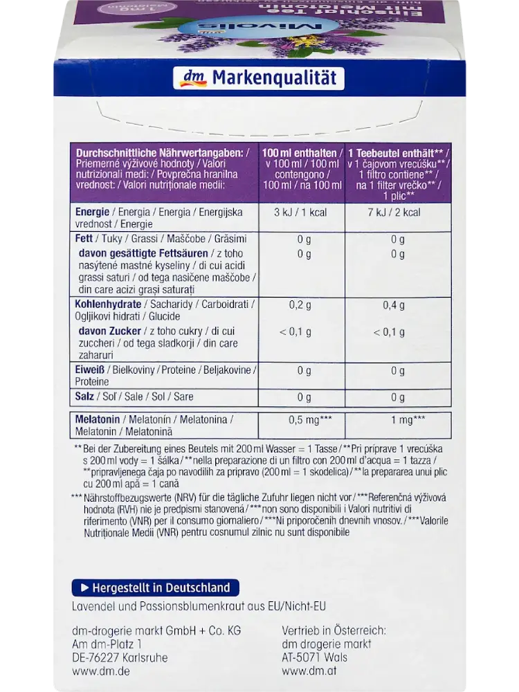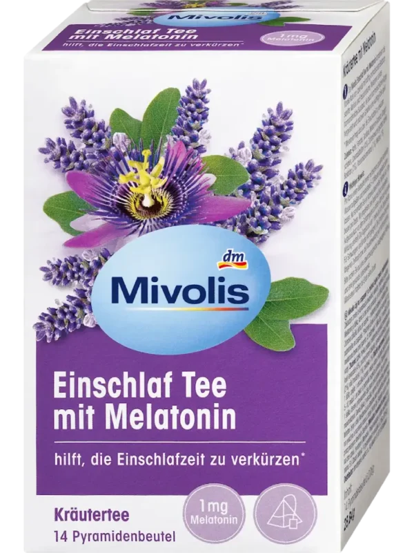 La tisane pour le sommeil de Mivolis avec mélatonine associe la note florale de lavande à la saveur intense et aromatique de la valériane, ainsi qu’à la douceur de la mélisse et de la passiflore.