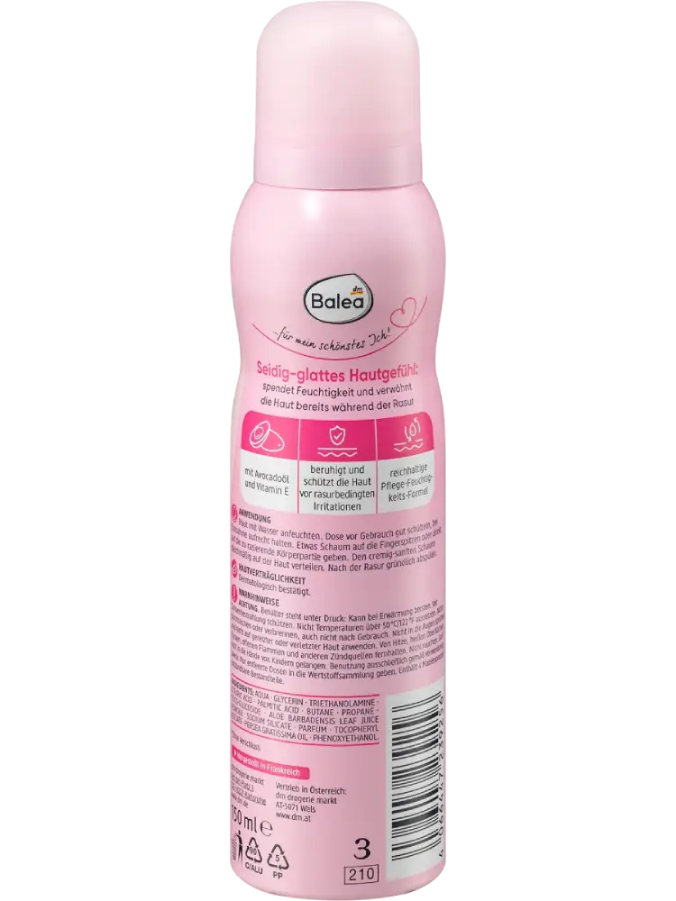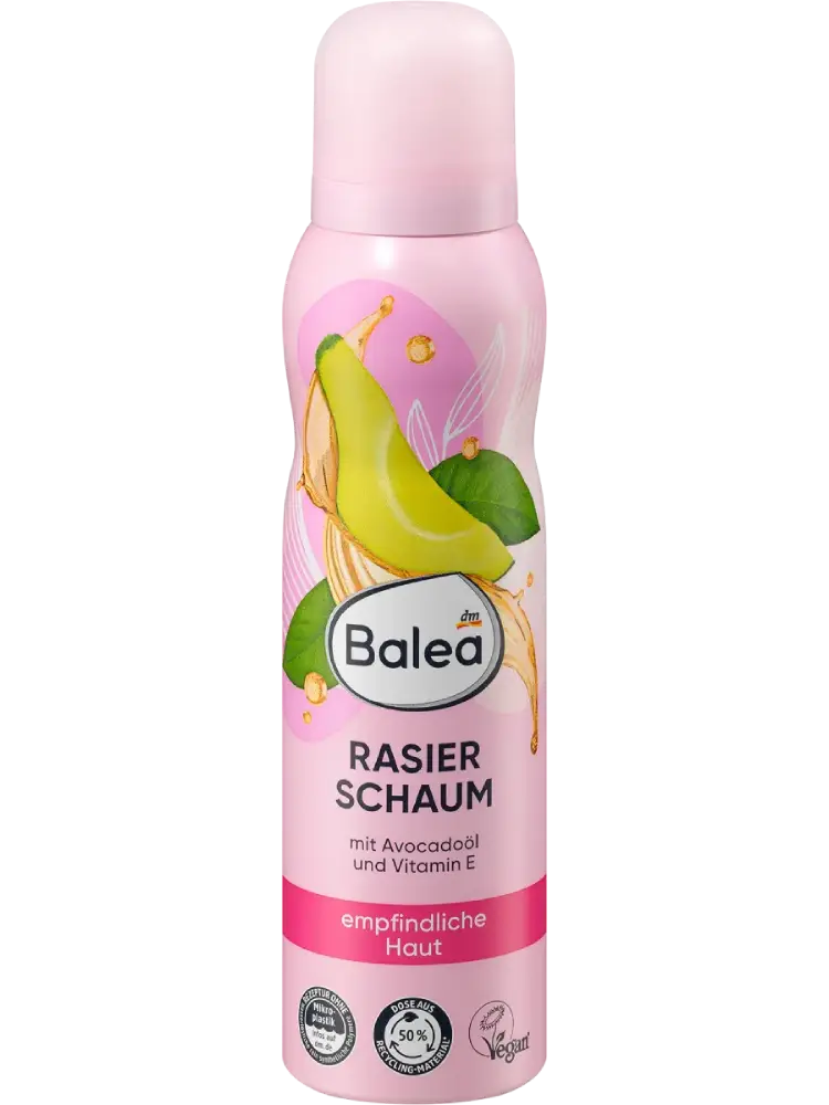 لإحساس واضح بالنعومة: رغوة الحلاقة من Balea بزيت الأفوكادو، فيتامين E، والألوة فيرا، مثالية للحلاقة الرطبة اللطيفة للمناطق الحساسة مثل الساقين، تحت الإبط، ومنطقة البكيني.