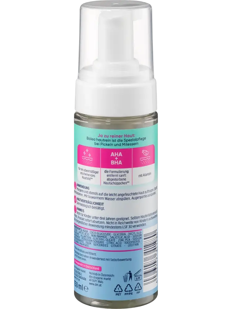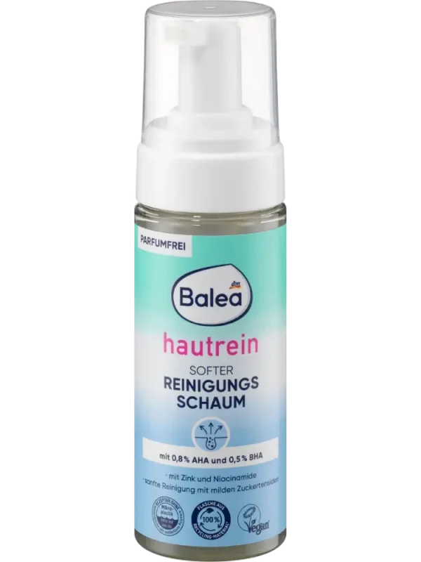 تعمل رغوة التنظيف Hautrein من Balea على تنظيف البشرة وتقشيرها بلطف. بفضل التركيبة الفعّالة التي تحتوي على AHA (حمض اللاكتيك) وBHA (حمض الساليسيليك)، تتم إزالة خلايا الجلد الميتة بلطف، مما يمنح البشرة مظهرًا أكثر إشراقًا.