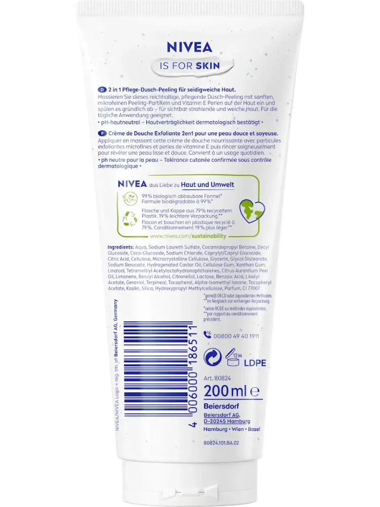Le gommage crème NIVEA combine nettoyage et soin en un seul produit et convient parfaitement pour la douche quotidienne. Grâce à ses micro-particules exfoliantes et ses perles de vitamine E, il élimine en douceur les cellules mortes de la peau, tandis que sa texture crémeuse laisse la peau douce et soyeuse.