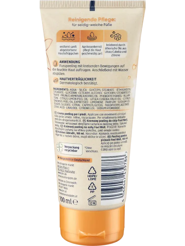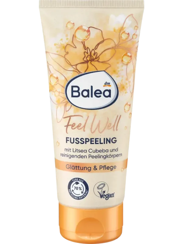 Le peeling crème pour les pieds Feel Well Litsea Cubeba de Balea est idéal pour le soin nettoyant des pieds. Le tube peeling est composé à 70% de matière recyclée (sans bouchon) et sa compatibilité cutanée a été confirmée dermatologiquement.
