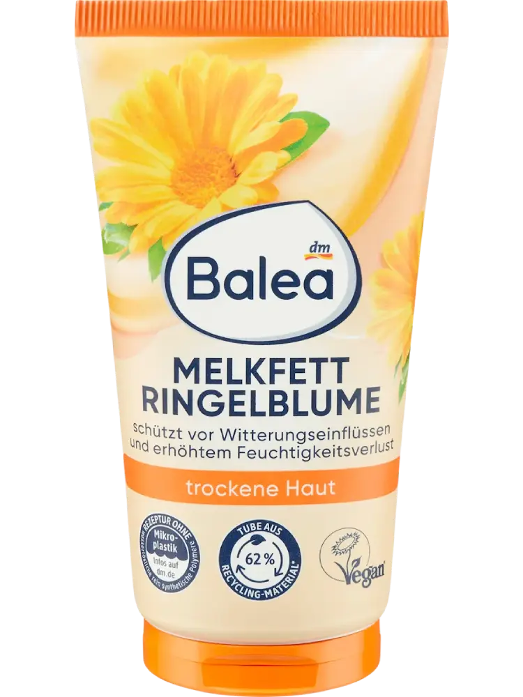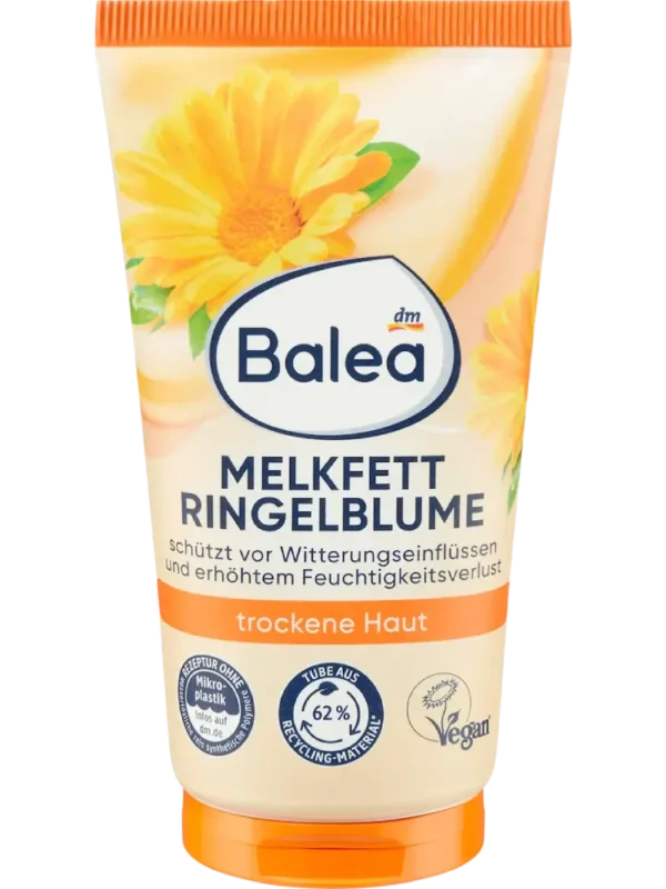 يعمل دهن الحلاب بأزهار الآذريون (الكالنديولا) من Balea على حماية البشرة من العوامل البيئية القاسية ويقلل من فقدان الرطوبة، ما يجعله مثاليًا للبشرة الجافة. يوفر هذا الكريم عناية مكثفة تمنح البشرة ملمسًا ناعمًا ومرنًا.