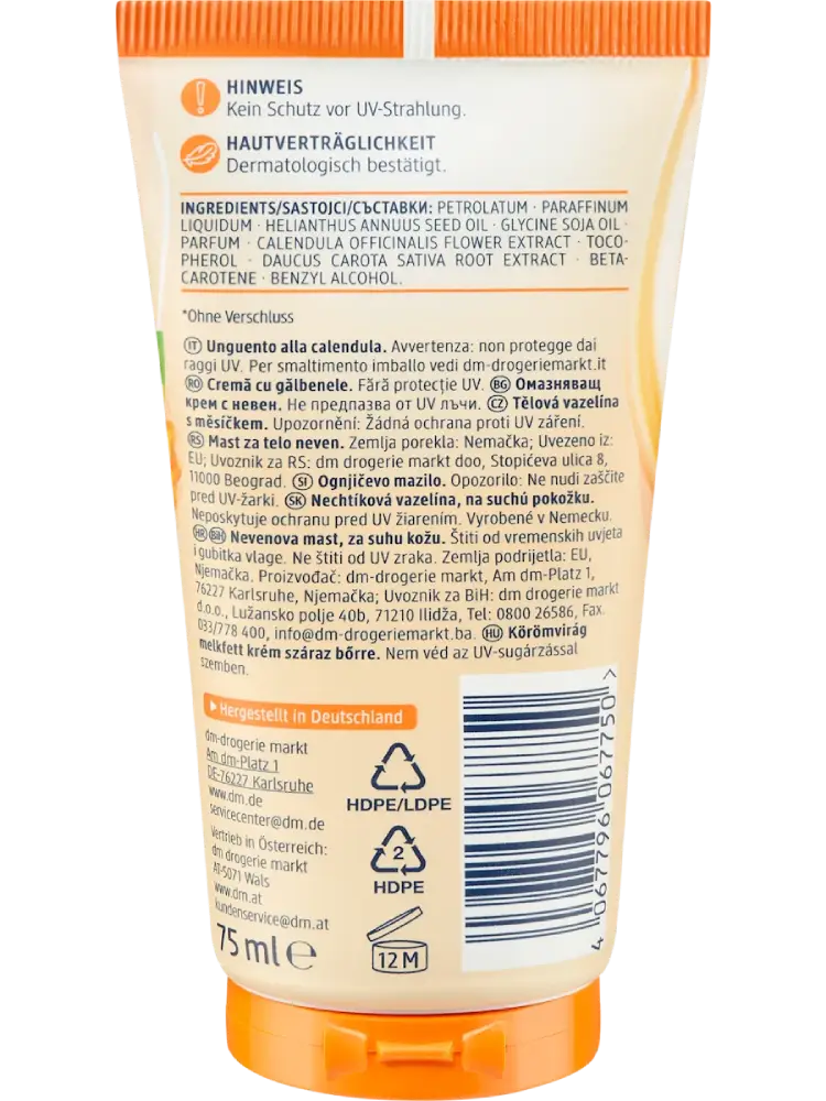 La pommade protectrice au souci (calendula) de Balea protège contre les agressions extérieures et la déshydratation excessive, idéale pour les peaux sèches. Ce soin intensif procure une sensation de peau souple et douce. Il aide également à renforcer la barrière cutanée et à réduire la perte d’hydratation.