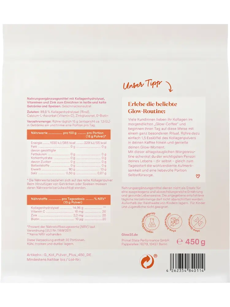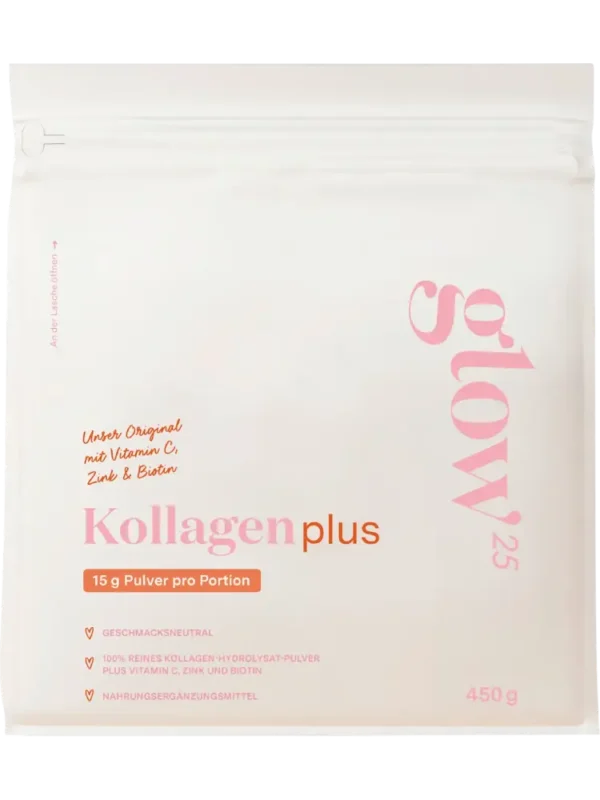 يحتوي مسحوق كولاجين بلس من Glow25 على الكولاجين عالي الجودة بالإضافة إلى الزنك والبيوتين. بفضل حجم الببتيد الصغير، يعتبر المكمل الغذائي الذي يحتوي على ببتيدات من النوع 1 و 3 سريع الذوبان وبدون طعم.