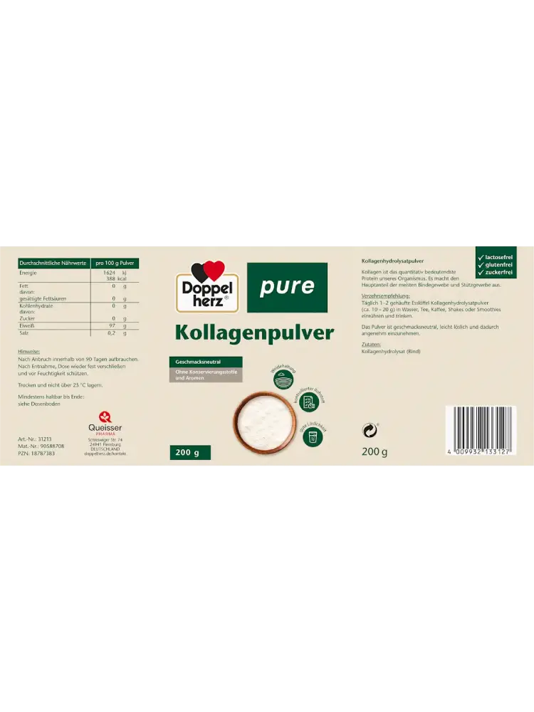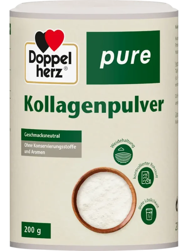 بودرة الكولاجين من Doppelherz pure مكونة من كولاجين متحلل. يشكّل الكولاجين المكون الأساسي لمعظم الأنسجة الضامة والداعمة. البودرة ليس لها طعم ويمكن خلطها بسهولة مع أي نوع من المشروبات مثل الماء، الشاي، القهوة، المخفوقات أو السموذي. كما أن هذا المكمل الغذائي خالٍ من المواد الحافظة والنكهات.