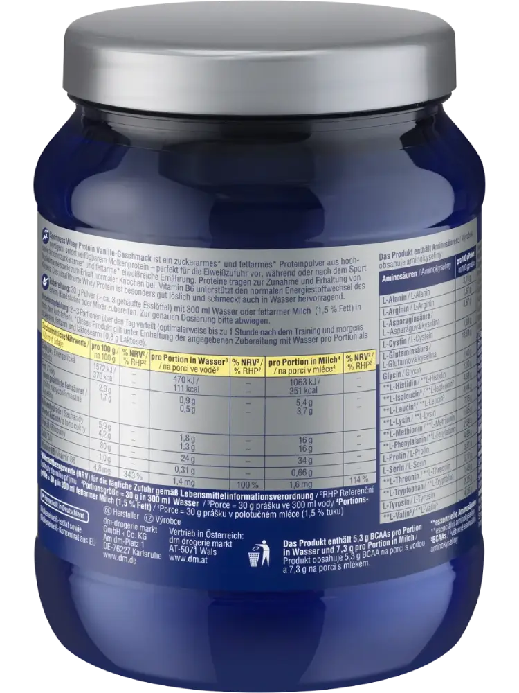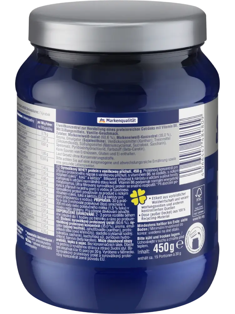 La protéine de lactosérum Sportness au goût vanille est un concentré de protéines pauvre en sucre* et en matières grasses*, composé de protéines de lactosérum de haute qualité et rapidement assimilables – idéale pour l’apport en protéines avant, pendant ou après le sport, ainsi que pour un régime riche en protéines et faible en sucre*. Les protéines contribuent à l’augmentation et au maintien de la masse musculaire ainsi qu’au maintien d’os normaux. La vitamine B6 soutient le métabolisme énergétique normal du corps. La protéine de lactosérum ultrafiltrée est particulièrement soluble et son goût est agréable même avec de l’eau.