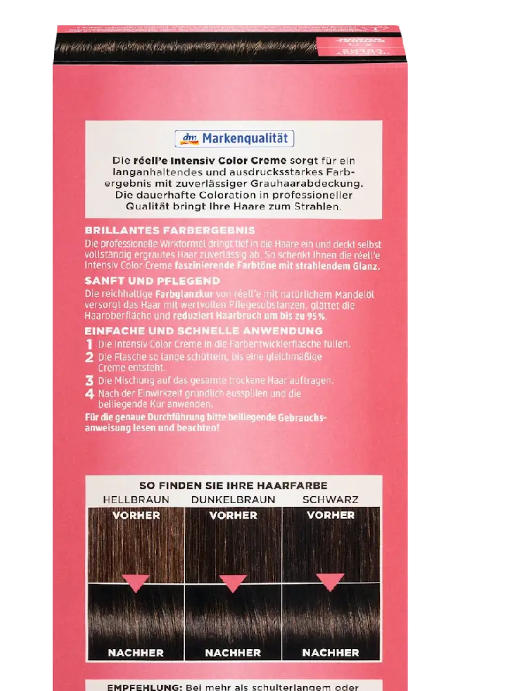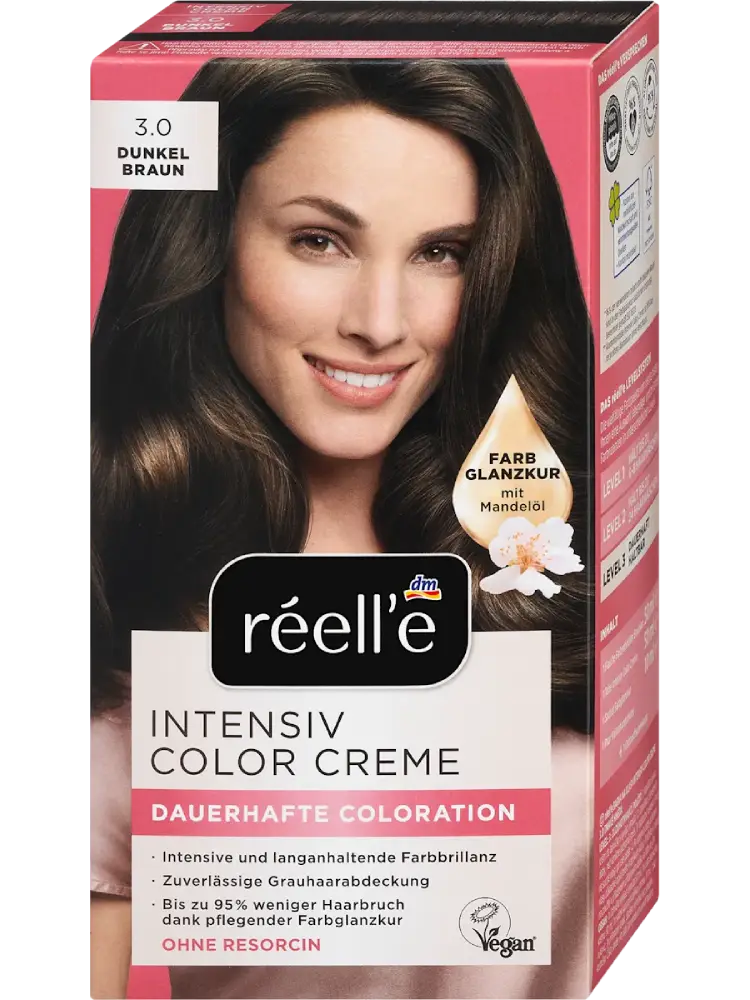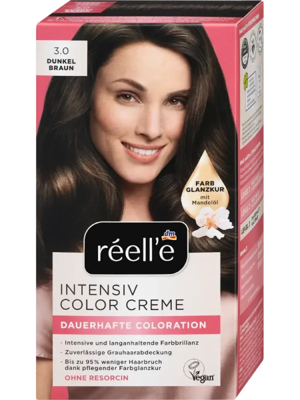 توفر كريم الصبغة المكثفة réell’e بدرجة بني داكن 3.0 نتيجة لونية متألقة. تعمل تركيبته الاحترافية على التغلغل بعمق داخل الشعر وتغطية حتى الشعر الأبيض بالكامل بشكل موثوق. تمنح لونًا طويل الأمد، قويًا ولامعًا يجعل الشعر متألقًا. كما أن ماسك العناية الغني بزيت اللوز الطبيعي يمد الشعر بالعناصر الغذائية القيّمة، ويملّس سطحه ويقلل من تكسره بنسبة تصل إلى 95٪. لظلال جذابة ولمعان مشرق.